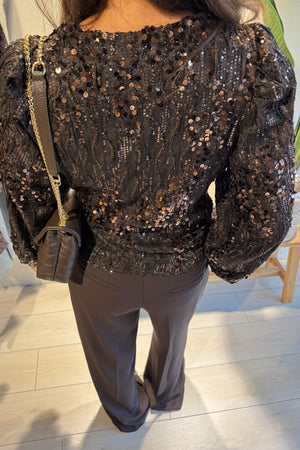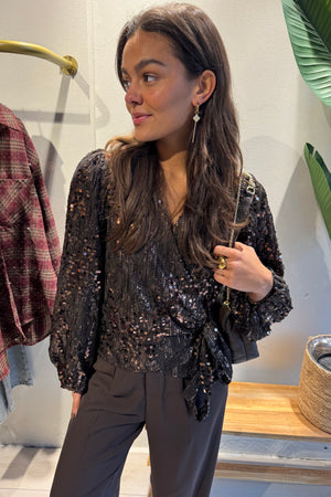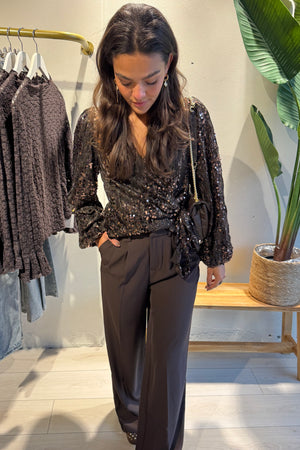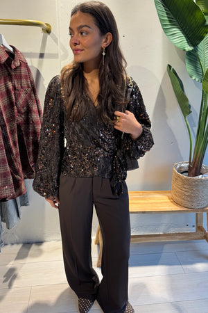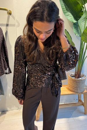 De Amelie top bruin is een feestelijke glitter top met een elegante V-hals en een schuine pasvorm die vastzit met een speelse strik. Dit maakt de top niet alleen stijlvol, maar ook perfect passend voor de feestdagen. Gemaakt om op te vallen tijdens kerstborrels, diners of gezellige avondjes uit. Verkrijgbaar in de maten S, M en L. Het model is 1,66 m en draagt maat S.