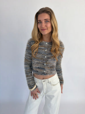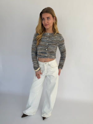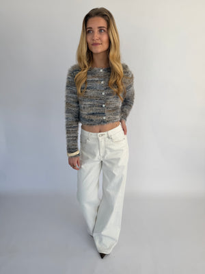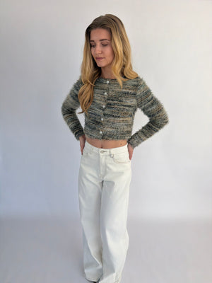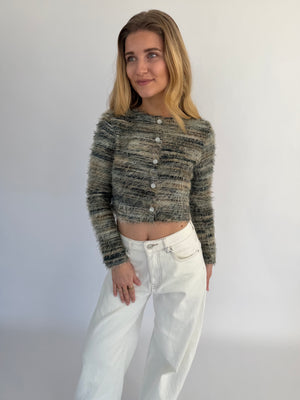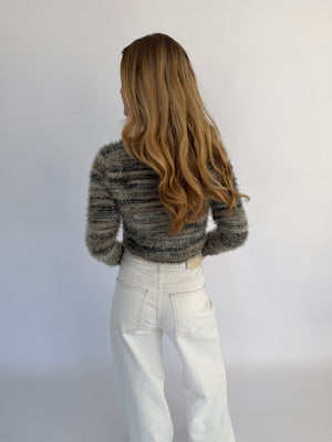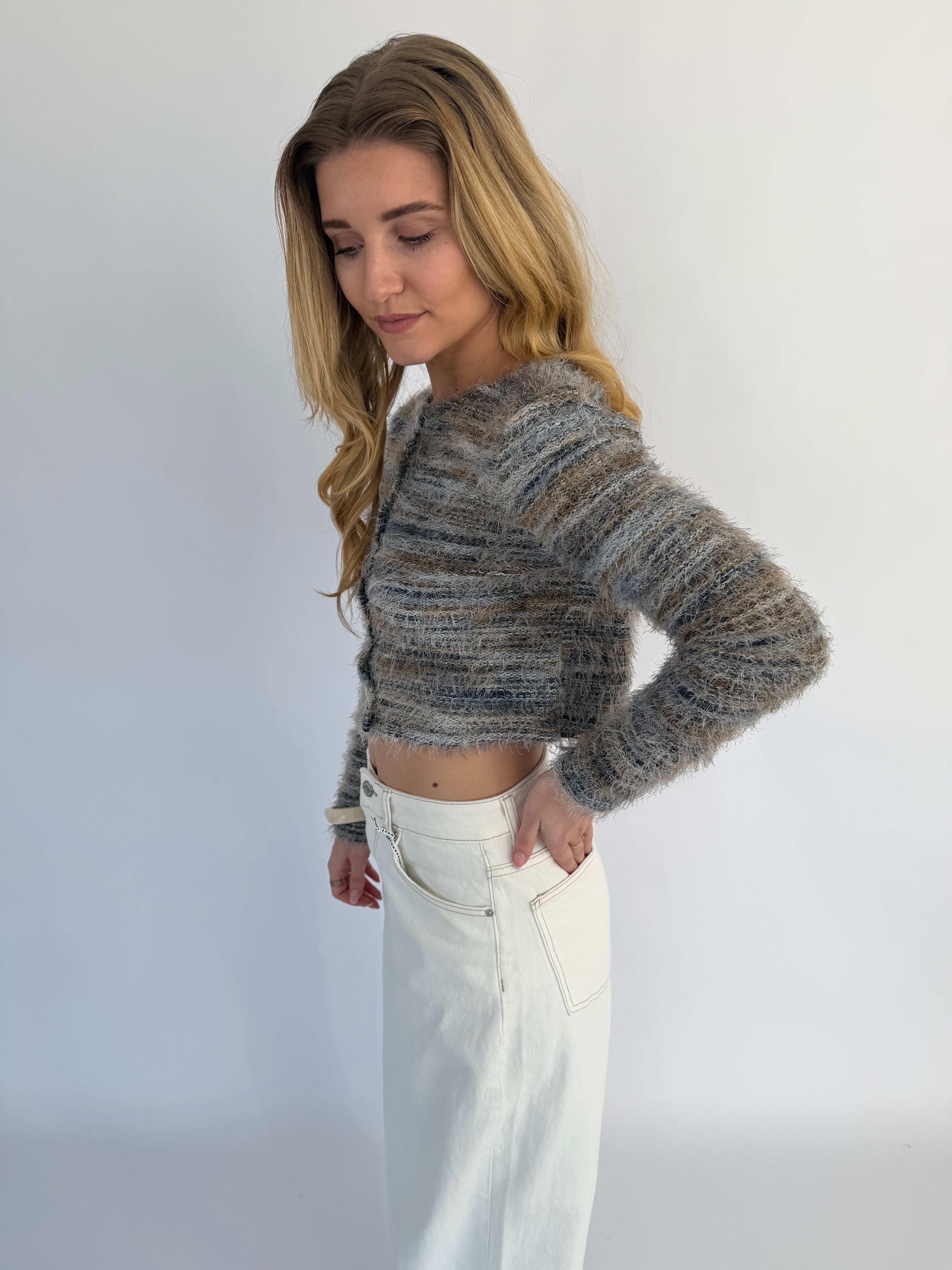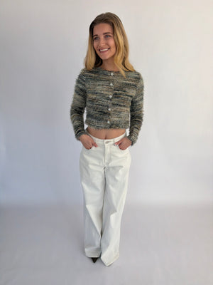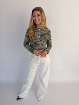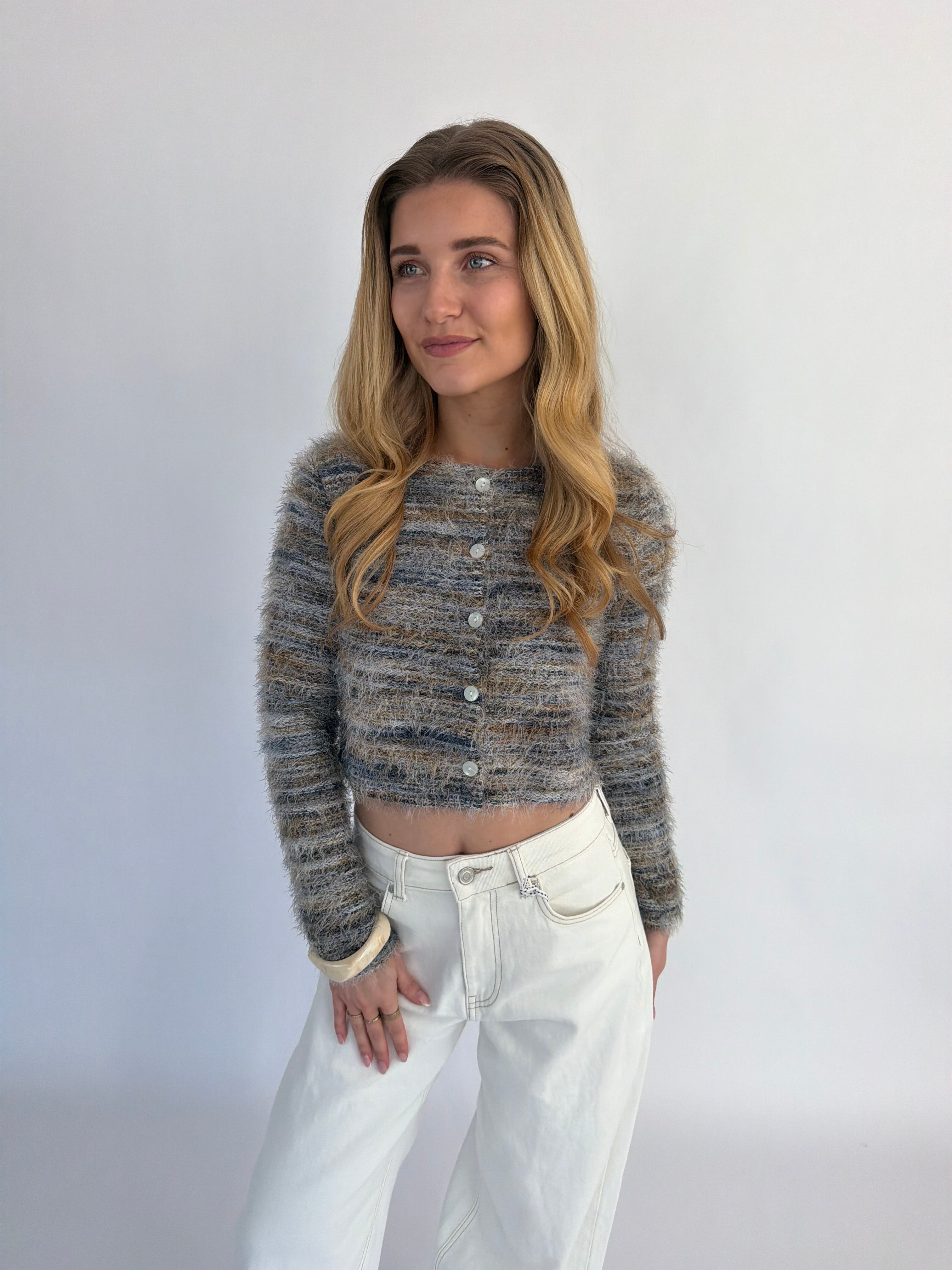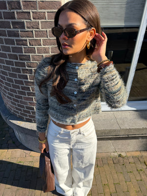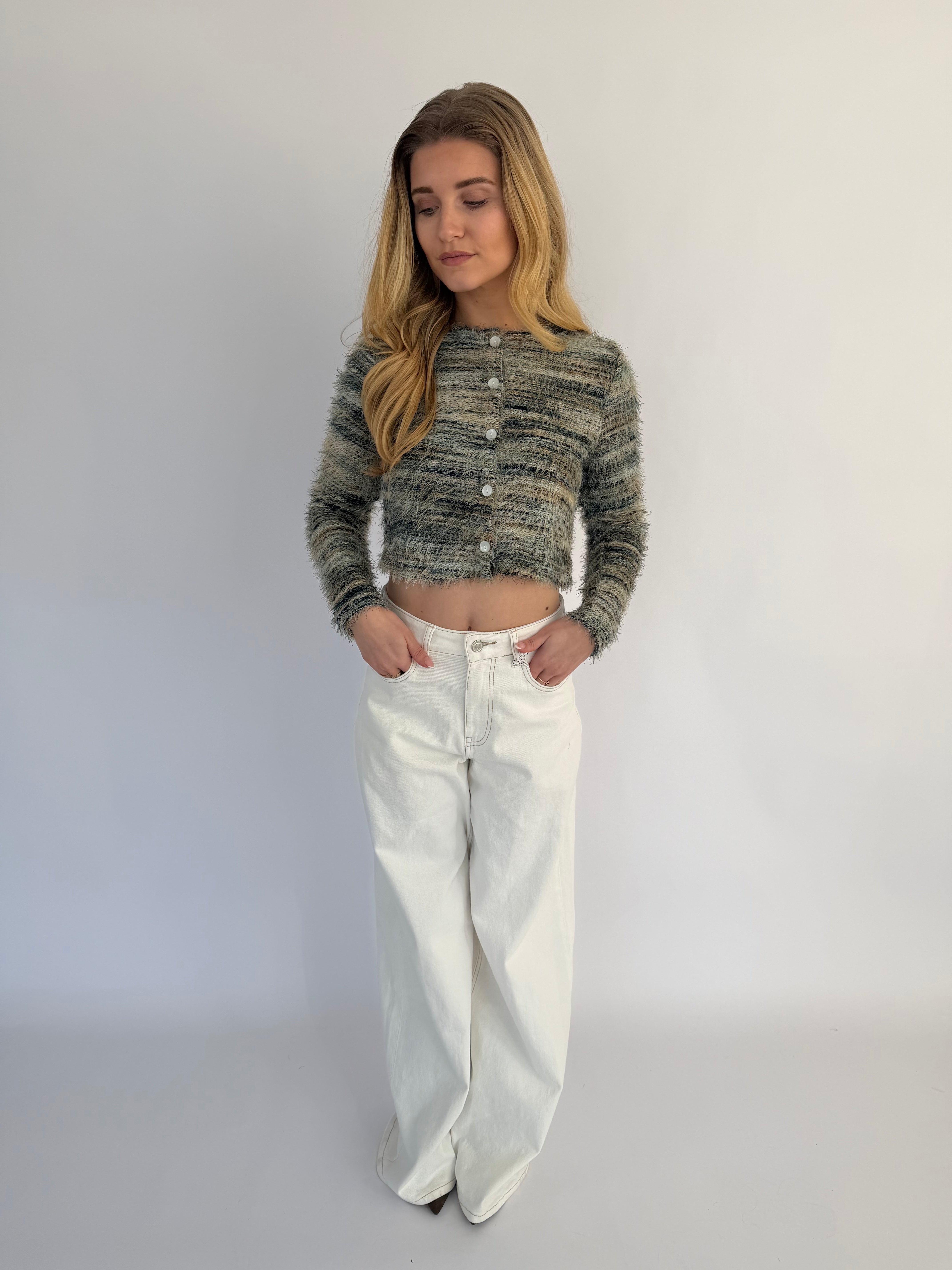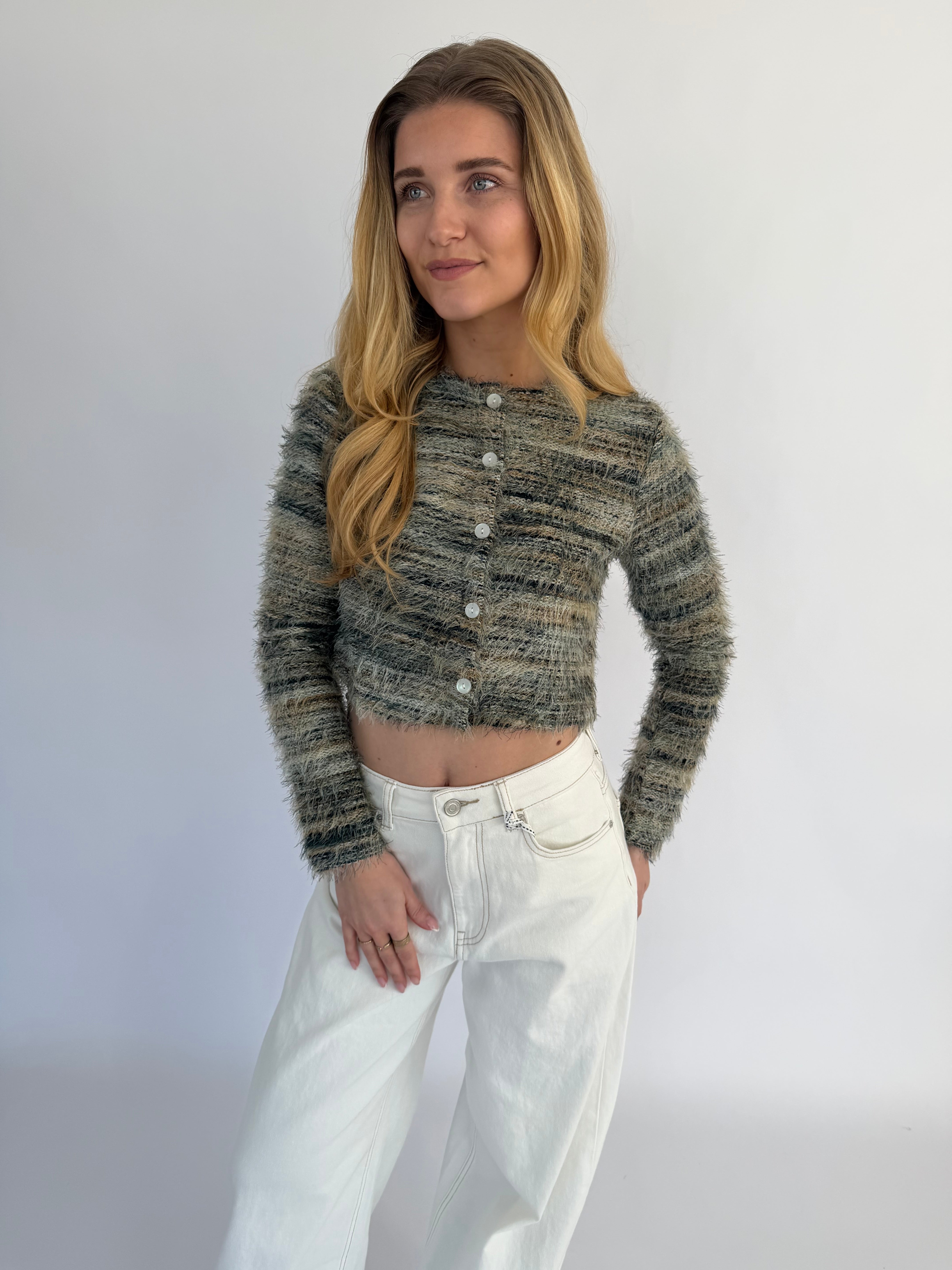 Arlena trui, een opvallende trui met een speels draadjes-effect en een textuurrijke uitstraling. Verkrijgbaar in twee kleuren: groen met subtiele witte en geelachtige details of wit met zachte groen-gele accenten, zodat je makkelijk een look kiest die bij je past.