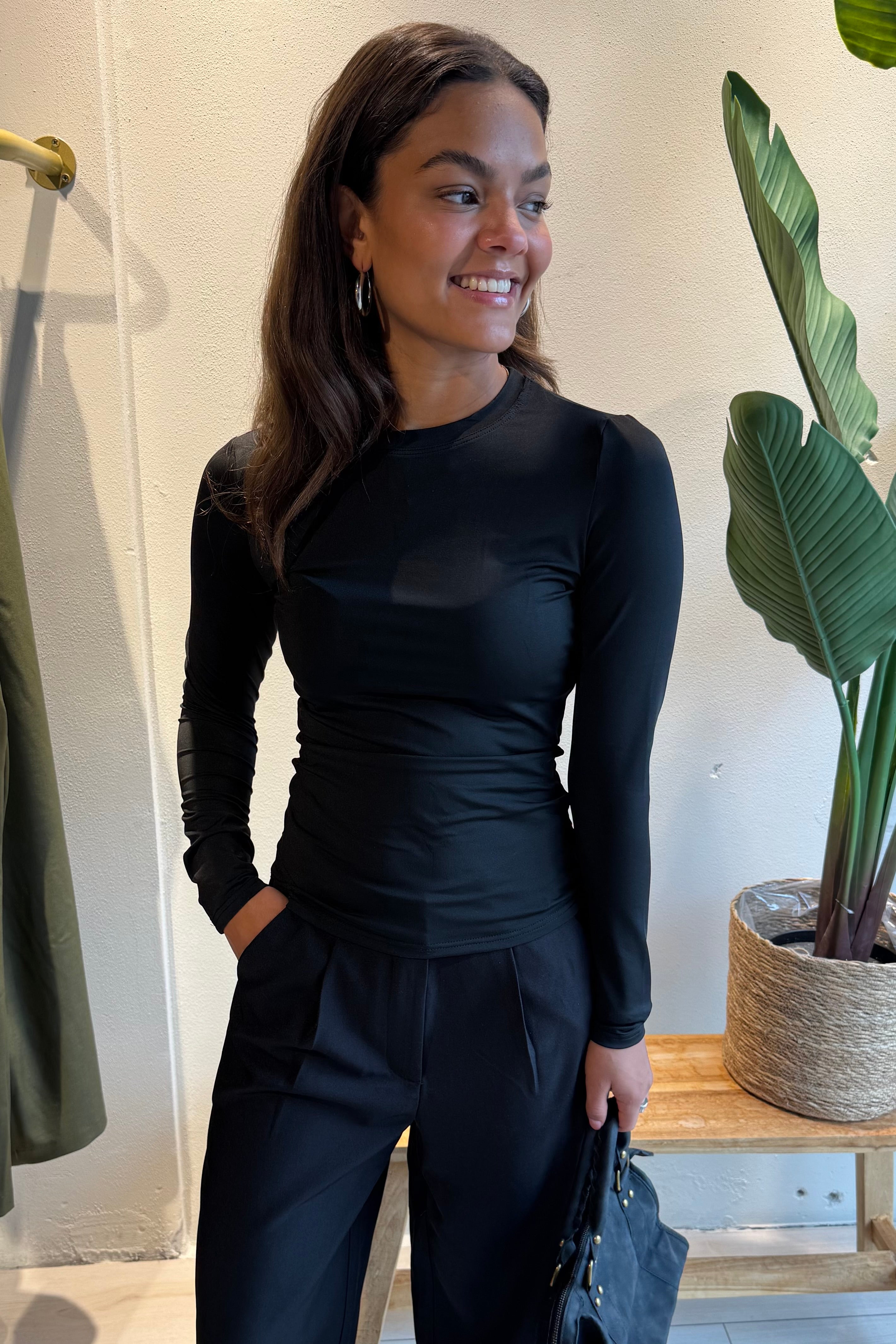 De Basic black top is een stijlvolle en comfortabele basic die niet mag ontbreken in je kledingkast. Dankzij de elastische pasvorm sluit hij mooi aan op het lichaam en voelt hij zacht en soepel aan. Het gladde materiaal geeft de top een moderne, nette uitstraling – ideaal om eindeloos mee te combineren.
