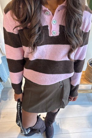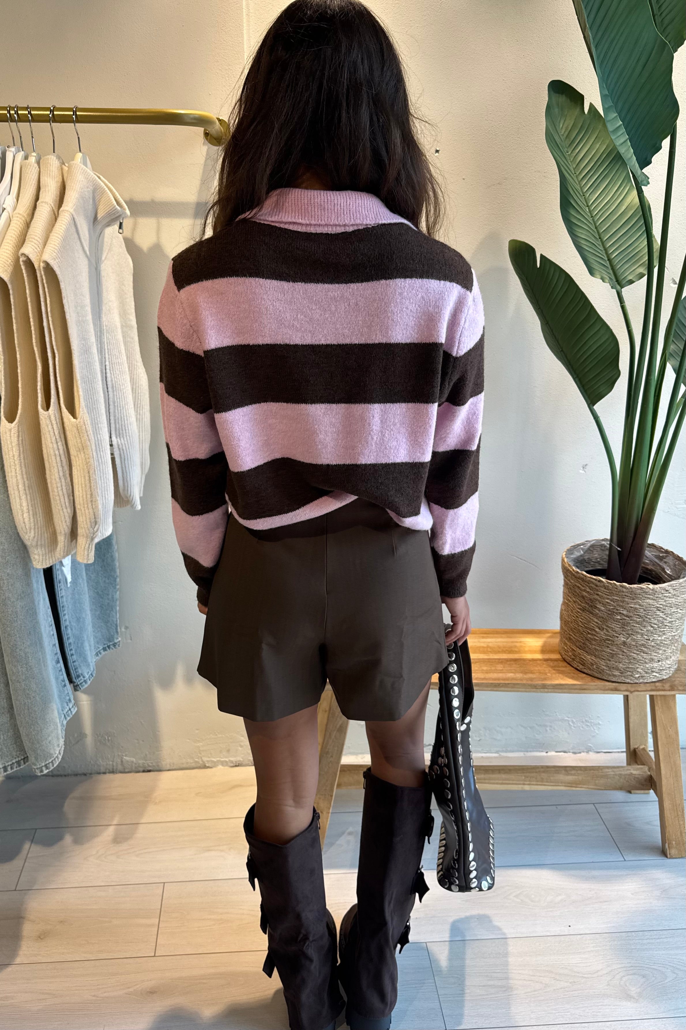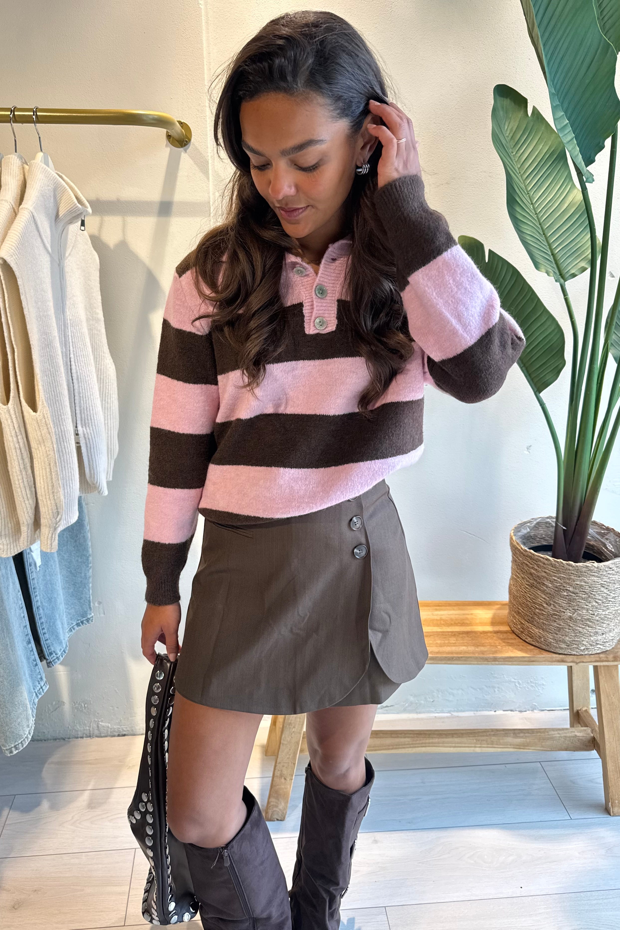 Maak je look helemaal af met de Faye trui. De grote strepen in bruin en roze geven een vrolijke en trendy touch aan je outfit. Het polo-model met kraagje en drie knoopjes aan de bovenkant maakt de trui nét even anders en super stijlvol. Gemaakt van een zachte mix van acryl, polyamide, polyester, wol en viscose, zodat hij heerlijk comfortabel en warm zit.