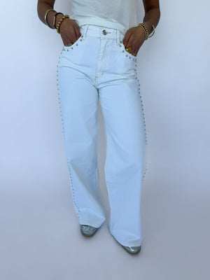 De straight-leg pasvorm loopt strak aan de bovenkant en valt losjes naar beneden voor een tijdloze, flatterende look. Subtiele zilveren bolletjes aan de zijnaad geven de jeans een speels en uniek detail. Perfect te combineren met blouses, tops of truien voor een casual-chique outfit.