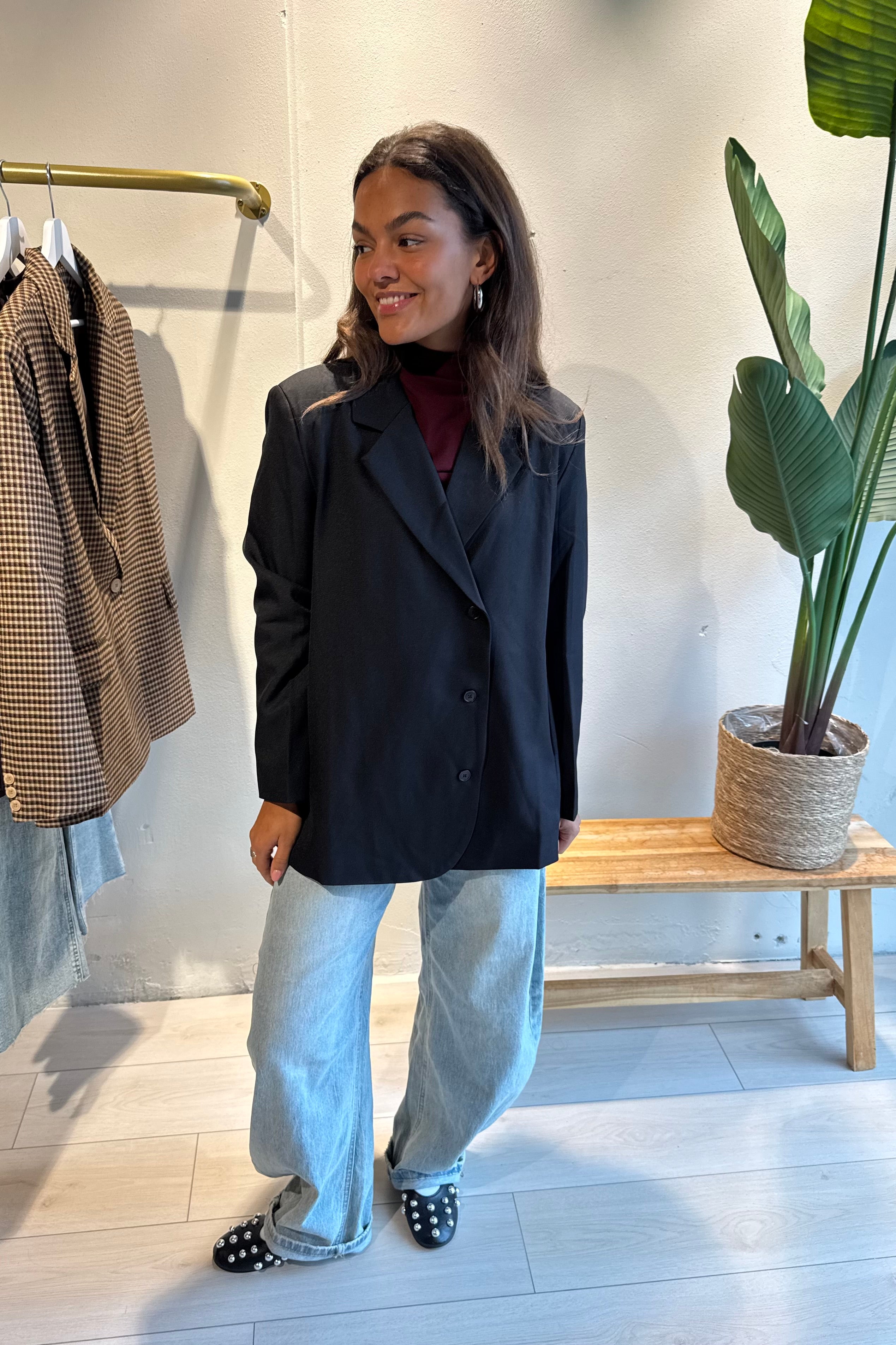 De Hidaya Blazer is de perfecte mix van classy en trendy. Deze lange blazer in een diepe zwarte kleur is een echte eyecatcher, zonder te overdrijven. De drie kleine knoopjes aan de voorkant zorgen voor een verfijnde look, en de langere pasvorm geeft ‘m net dat beetje extra stijl.