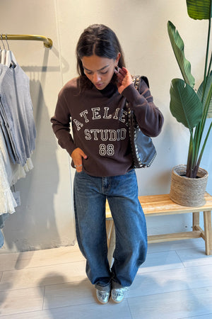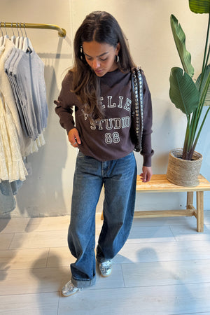 Maak je outfit compleet met deze bruine trui met witte letters. Het zachte materiaal voelt comfortabel aan en houdt je heerlijk warm. De witte letters geven de trui een stoer en casual detail. Perfect te combineren met onze joanna balloon jeans dark.