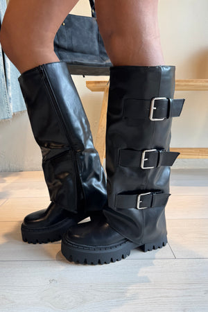 De Juna laarzen zijn dé perfecte combinatie van comfort en stijl. Deze lange laarzen in zwart nepleer hebben drie elastische bandjes aan de zijkant voor een stoere, eigentijdse look. De stevige, hoge zool biedt extra comfort én een beetje extra lengte, terwijl het zachte lapje dat subtiel over de zool valt het design een unieke touch geeft. Perfect te combineren met jurkjes, rokjes of je favoriete jeans voor een complete outfit.
