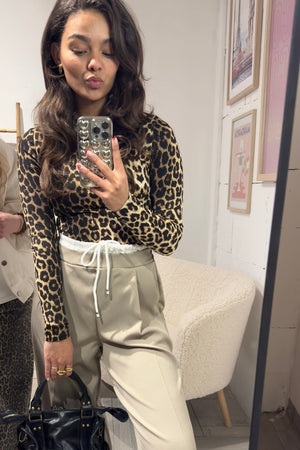 De Leopard Body is een statement piece dat je outfit direct een krachtige en trendy uitstraling geeft. Met zijn aansluitende pasvorm en opvallende panterprint is deze body perfect voor een avondje uit of een casual-chique look. Combineer met een high-waist broek of rok voor een moeiteloos stijlvolle outfit. Comfortabel, tijdloos en een echte eyecatcher!