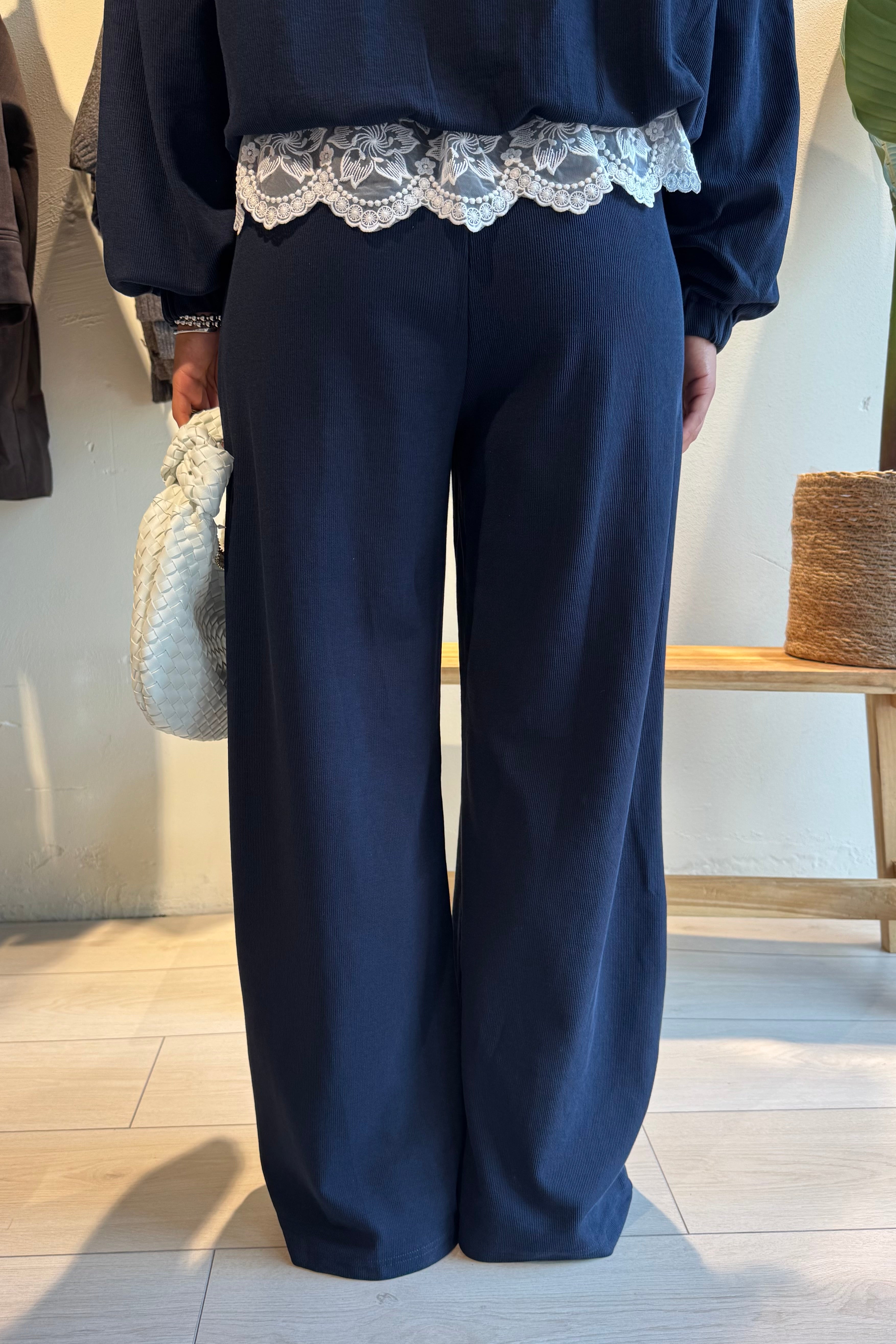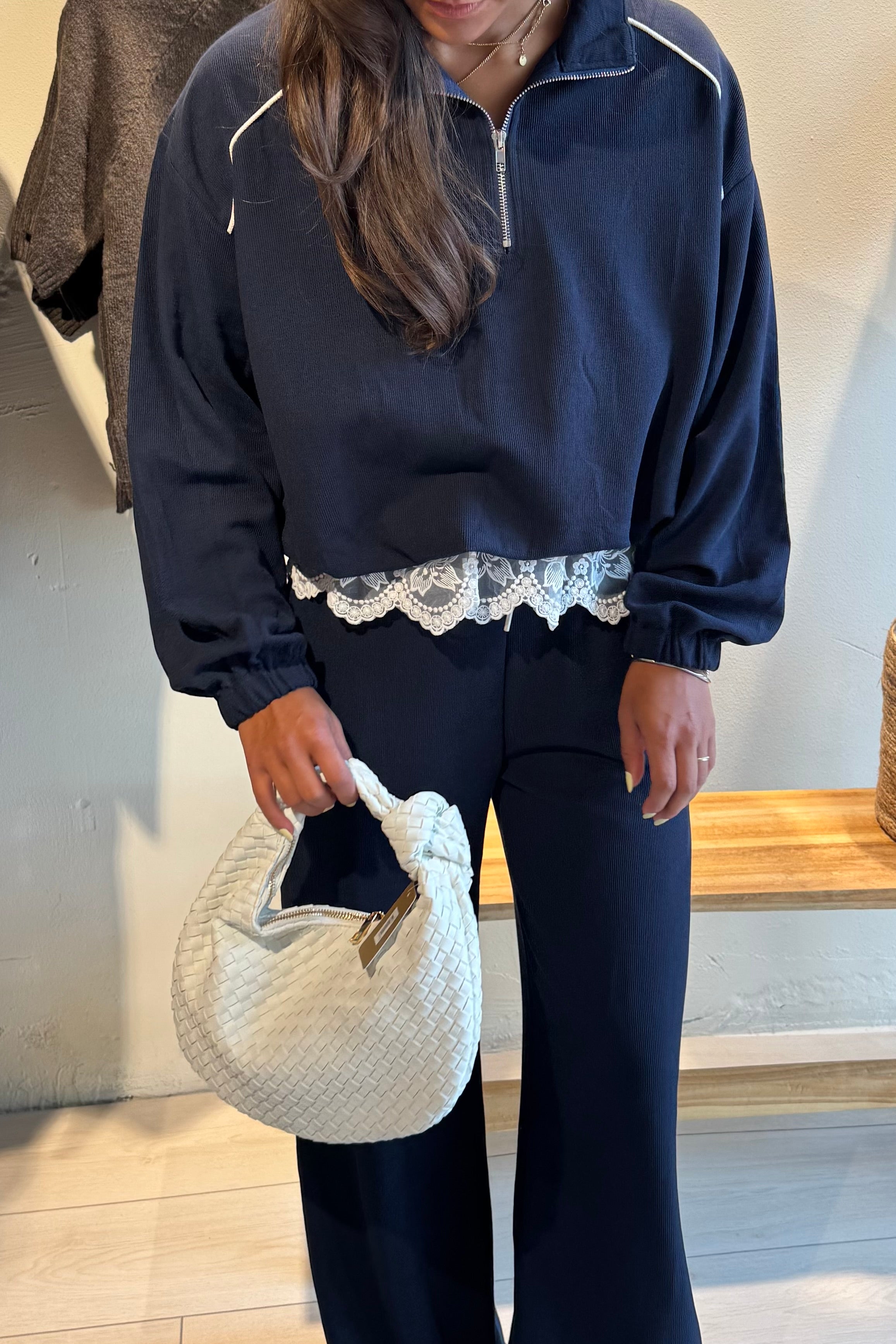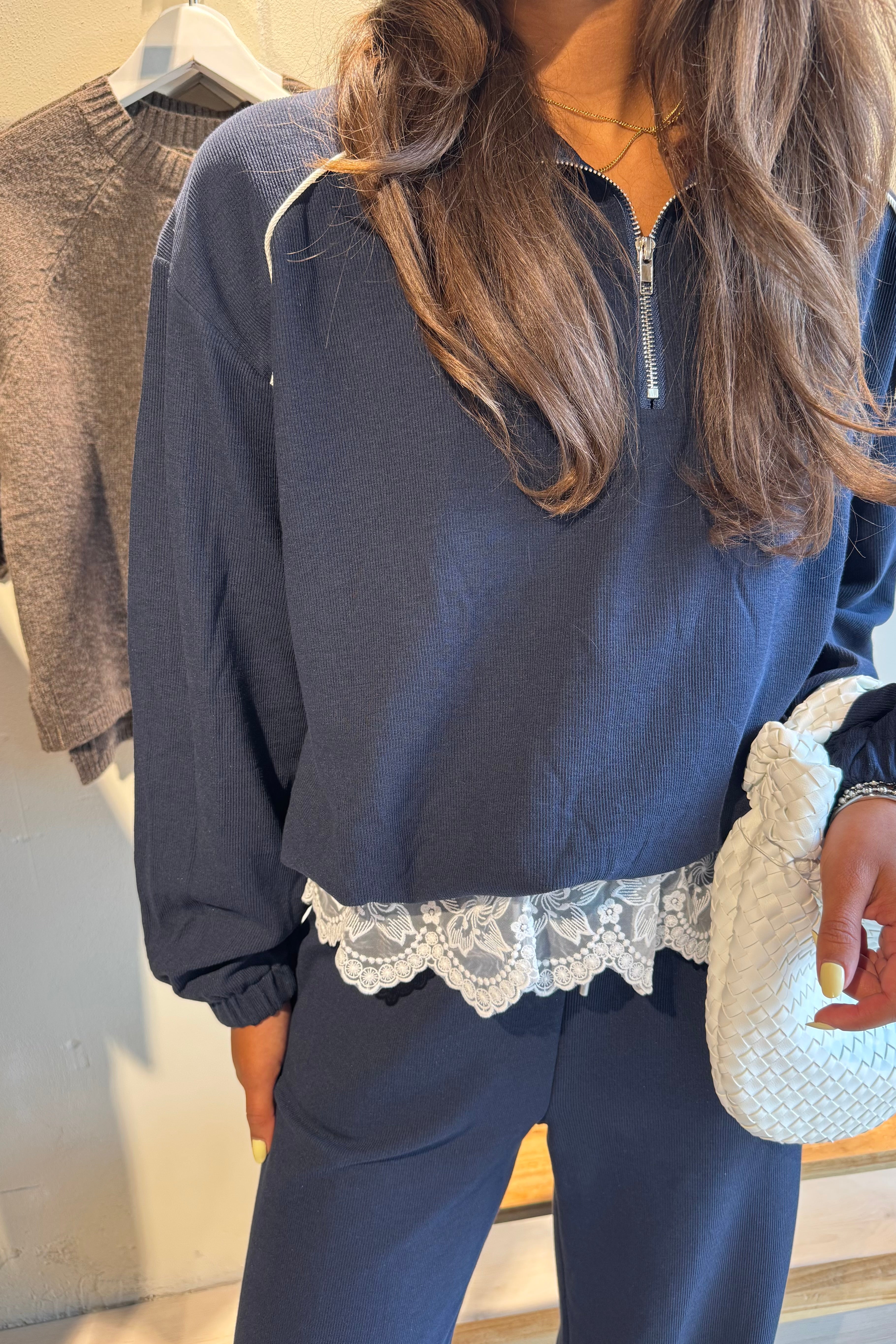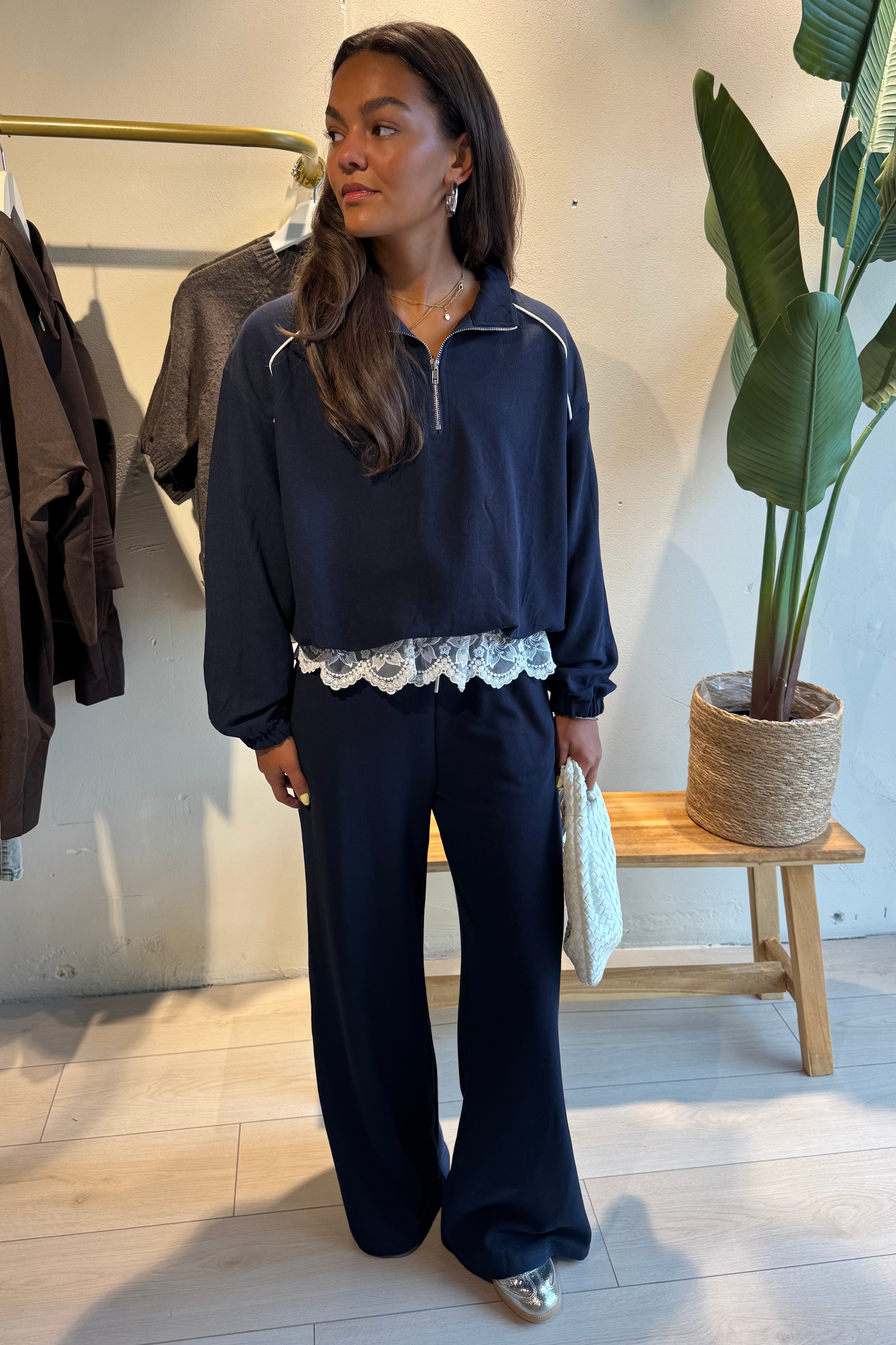 De Liv Joggerset is je nieuwe donkerblauwe favoriet voor comfy days! Het setje bestaat uit twee stukken en het vest krijgt een speels detail door het witte kanten randje aan de onderkant – dat maakt ‘m helemaal af. Perfect om lekker in te loungen of casual op pad te gaan. Let op: dit pak is niet geschikt voor tall. Het model is 167cm en draagt maat S/M