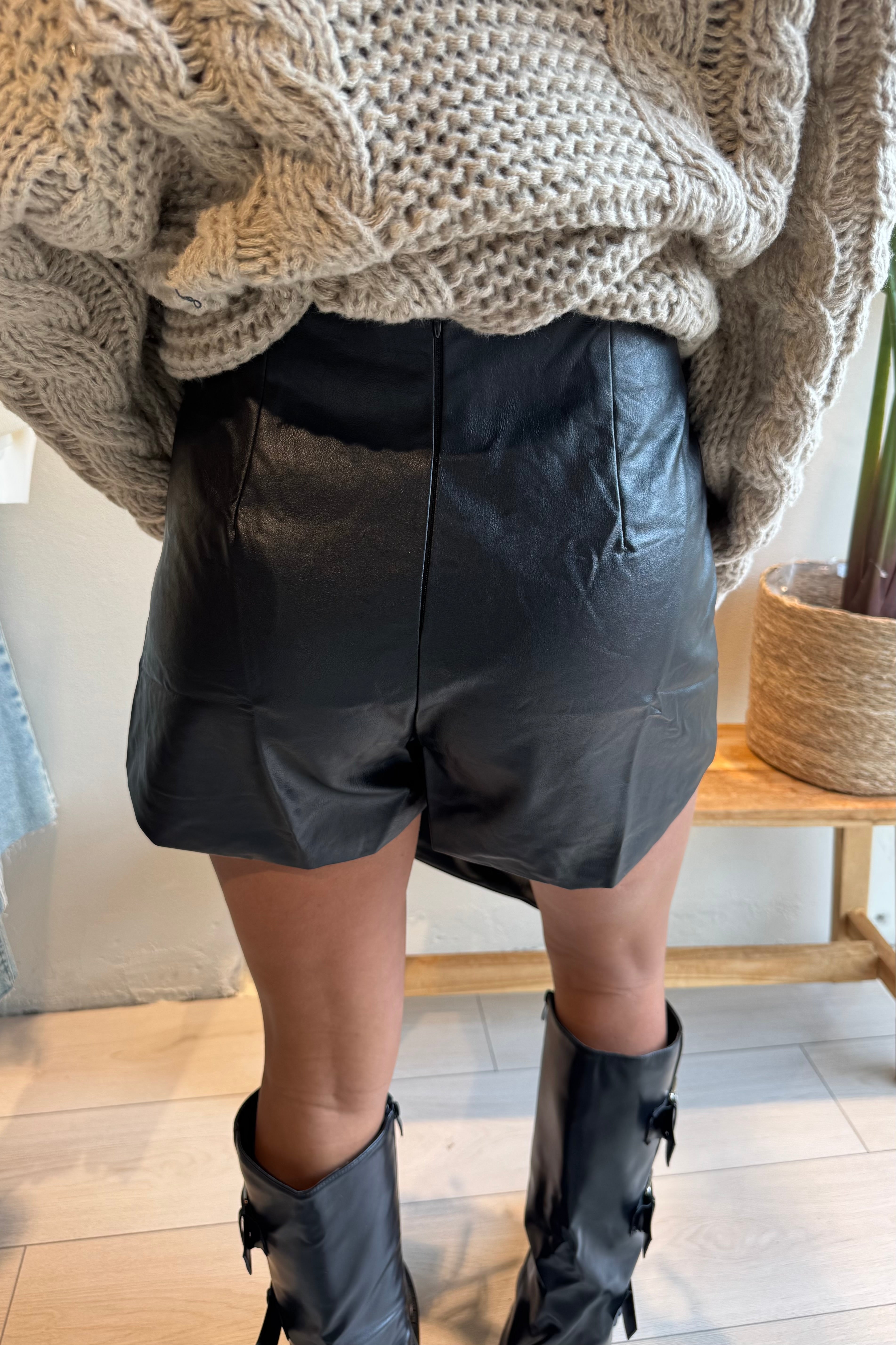 Maak je outfit af met de stoere en trendy Cleo short in zwart nepleer. Het materiaal voelt soepel en comfortabel aan, waardoor je hem moeiteloos kunt dragen – zowel casual als wat chiquer. De knoop aan de zijkant zorgt voor een uniek detail dat de short nét dat beetje extra geeft. Perfect te combineren met een oversized trui, blouse of cropped top voor een complete en stijlvolle look.