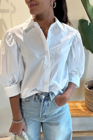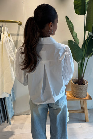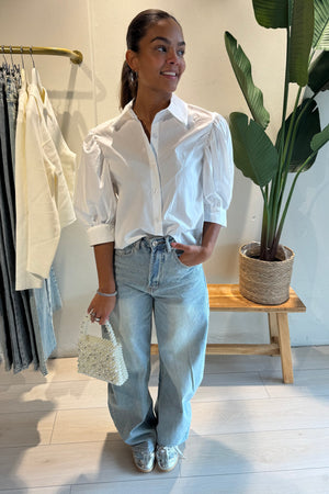Deze keer in een prachtige witte kleur – een neutrale basic die je eindeloos kunt combineren. De blouse heeft hetzelfde schattige kraagje en korte mouwtjes, waardoor hij lekker luchtig blijft, maar nét wat frisser en helderder oogt dan de bruine versie.