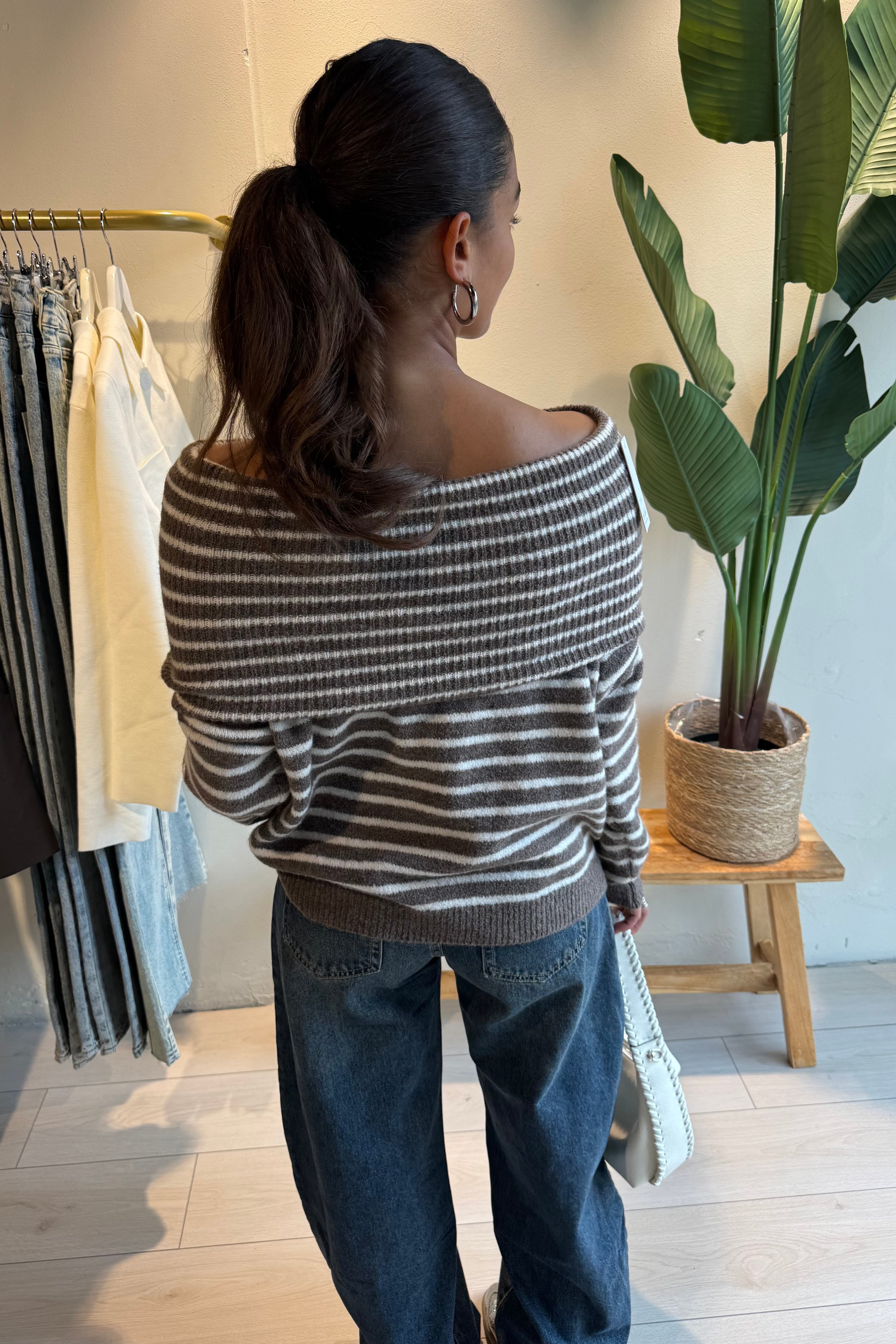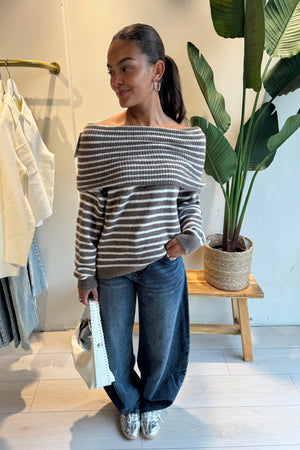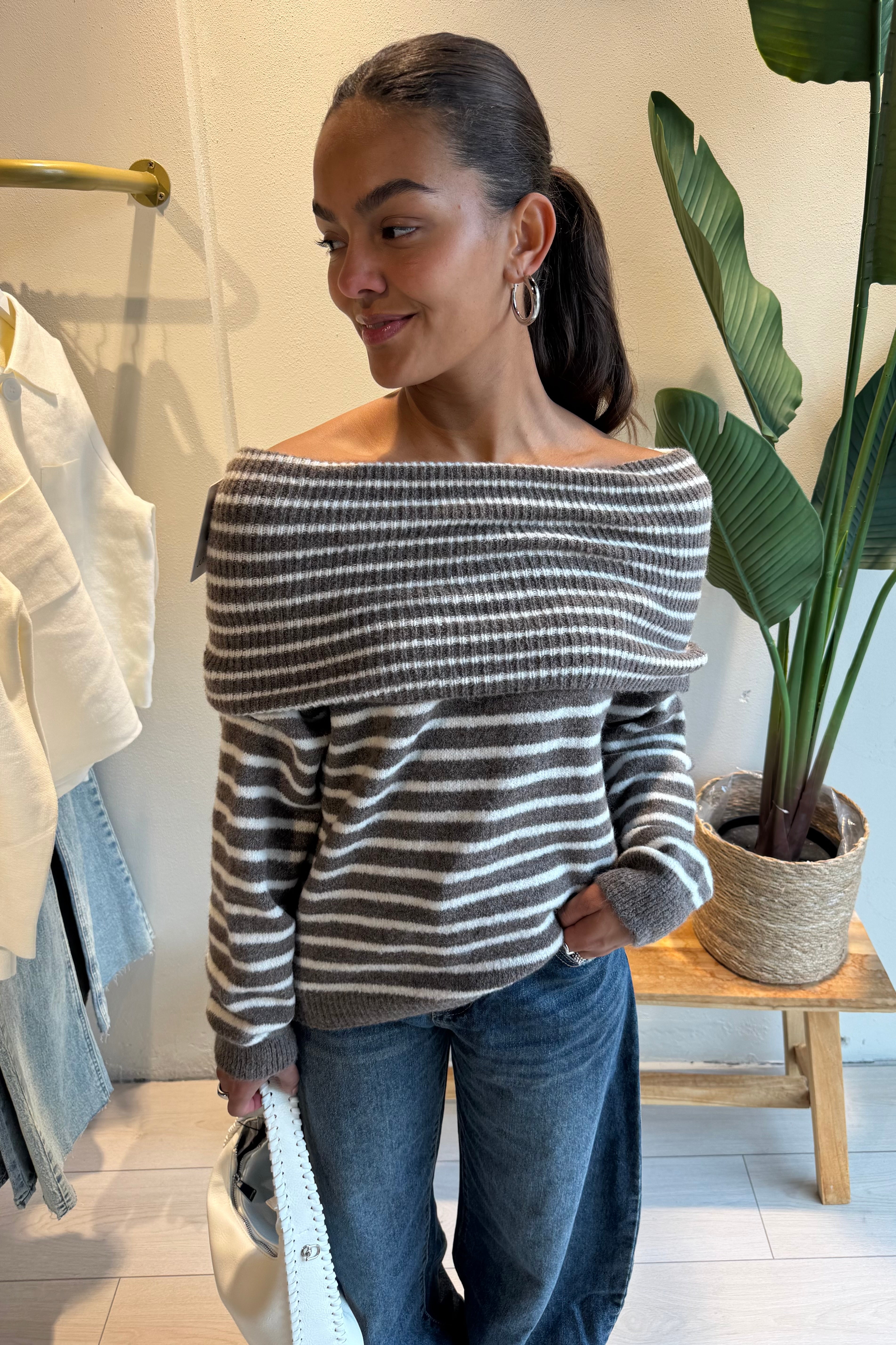 De Luvi trui is een echte eyecatcher voor het najaar! De combinatie van lichtbruine en witte strepen geeft een frisse, zachte look, terwijl de off shoulder pasvorm zorgt voor een vleugje speelsheid. Perfect om casual te dragen of juist iets chiquer te stylen met een mooie rok of pantalon.