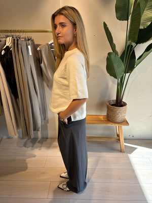 De zachte off white kleur geeft elke outfit een frisse, tijdloze basis. Dankzij het one size model sluit de top mooi aan bij verschillende maten en lichaamsvormen. Het materiaal voelt comfortabel aan en is licht elastisch, waardoor de May Top zowel los als ingestopt in een broek of rok prachtig valt.