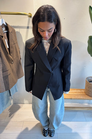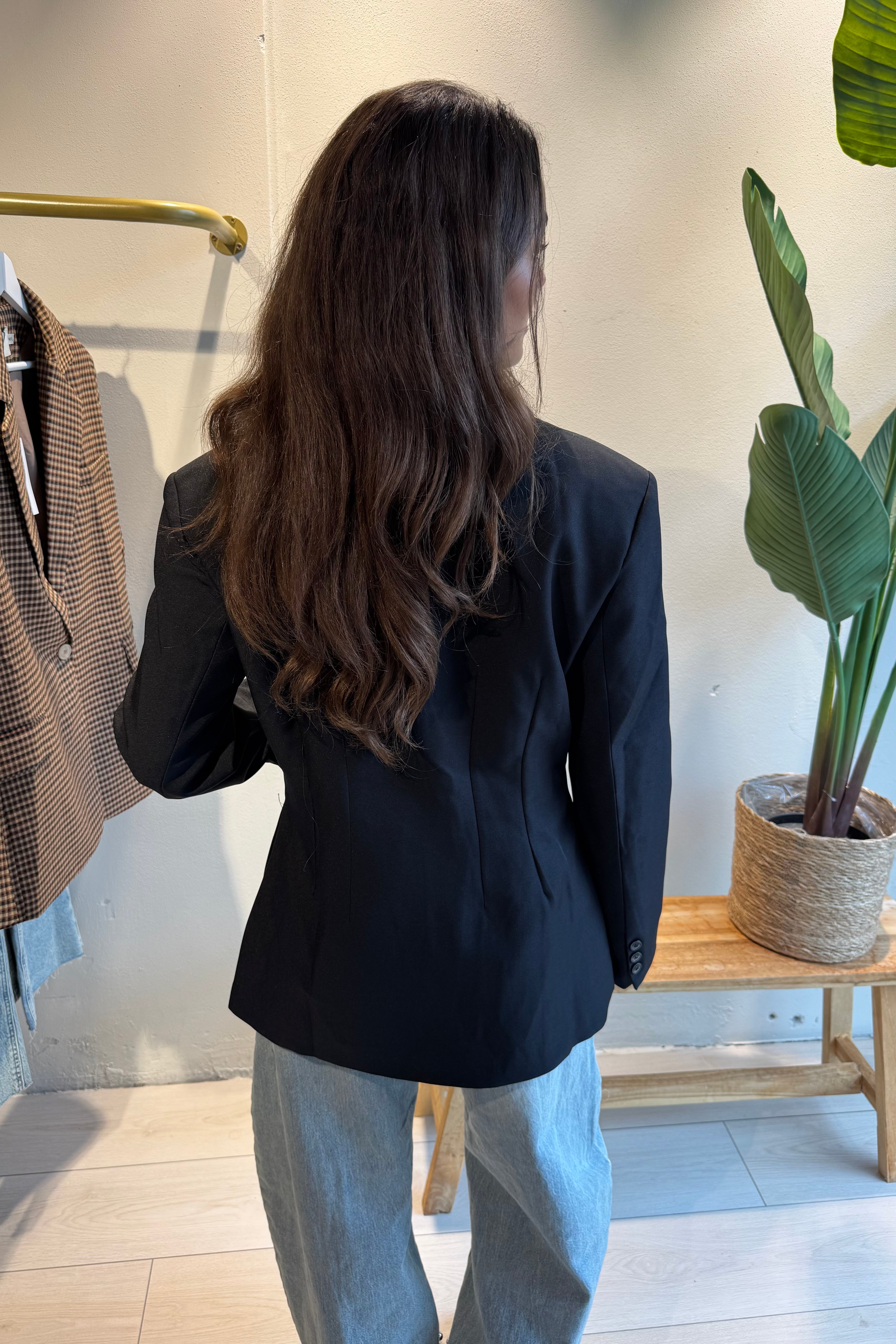 De Nikki Blazer is jouw nieuwe go-to voor een stijlvolle, vrouwelijke look. Deze zwarte blazer heeft een mooie, strakke pasvorm en valt soepel dankzij de stretchstof. De knoopjes bij de polsen geven ‘m een classy detail, en de ene grote knoop in het midden zorgt voor een nette sluiting. Met één subtiel zakje aan de zijkant heb je net dat beetje extra.