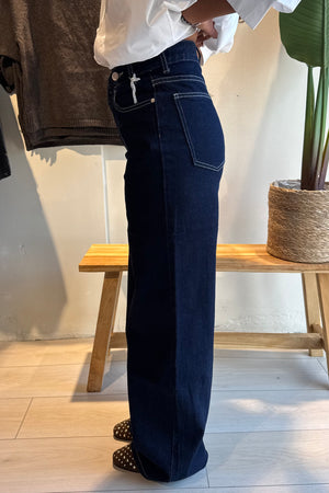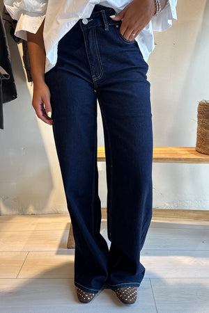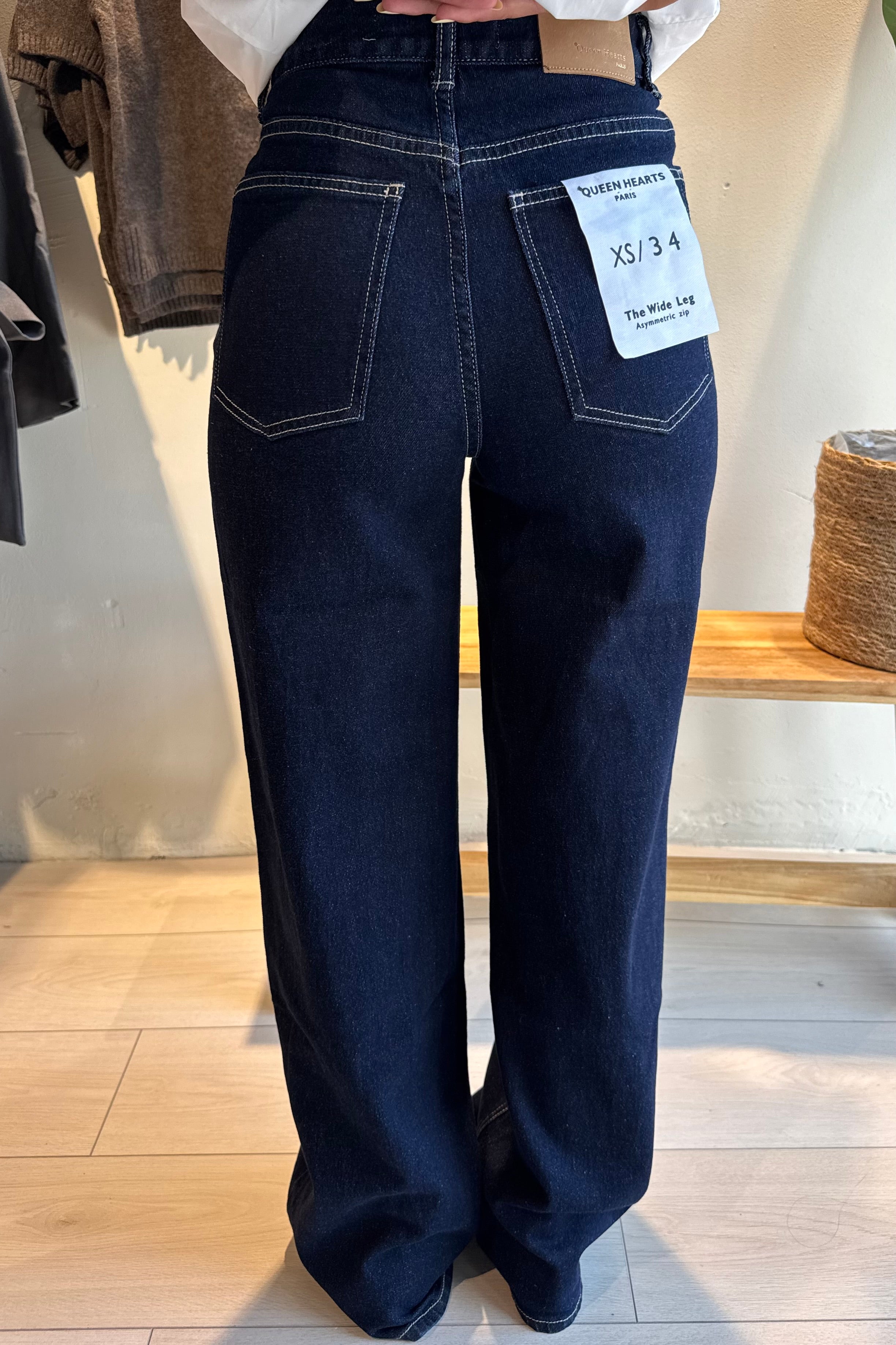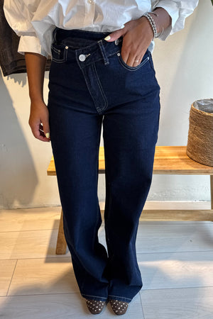De Nina jeans is een jeans van het merk Queen Hearts. De jeans heeft een stoere uitstraling door de schuine knoop. De donkere kleur is helemaal on trend en super mooi om te combineren met wit zoals wij doen. De jeans bevat een beetje stretch en valt netjes op maat. Ons model is 166cm en draagt maat 34.