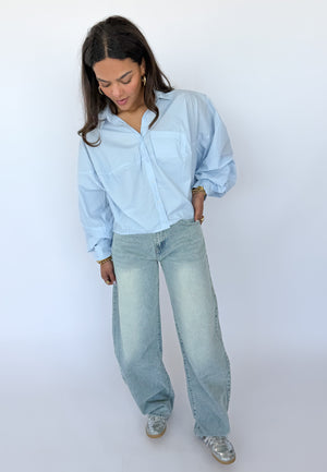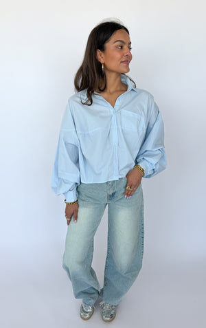 De Nolvi Blouse is een lichtblauwe, oversized blouse in one size, gemaakt van 100% katoen voor een zacht en ademend gevoel. De blouse heeft lange, losse mouwen die een relaxed en casual effect geven, en knoopjes aan de voorkant om hem eenvoudig vast te maken.