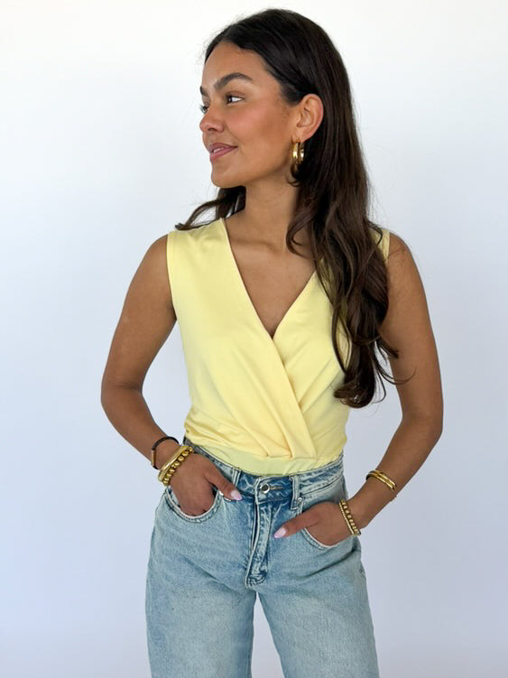 De Rena Body is een vrolijke, gele body met een elegante V-hals, gemaakt van 100% polyester. De stof voelt soepel en licht aan en zorgt voor een comfortabele pasvorm die mooi aansluit op het lichaam.