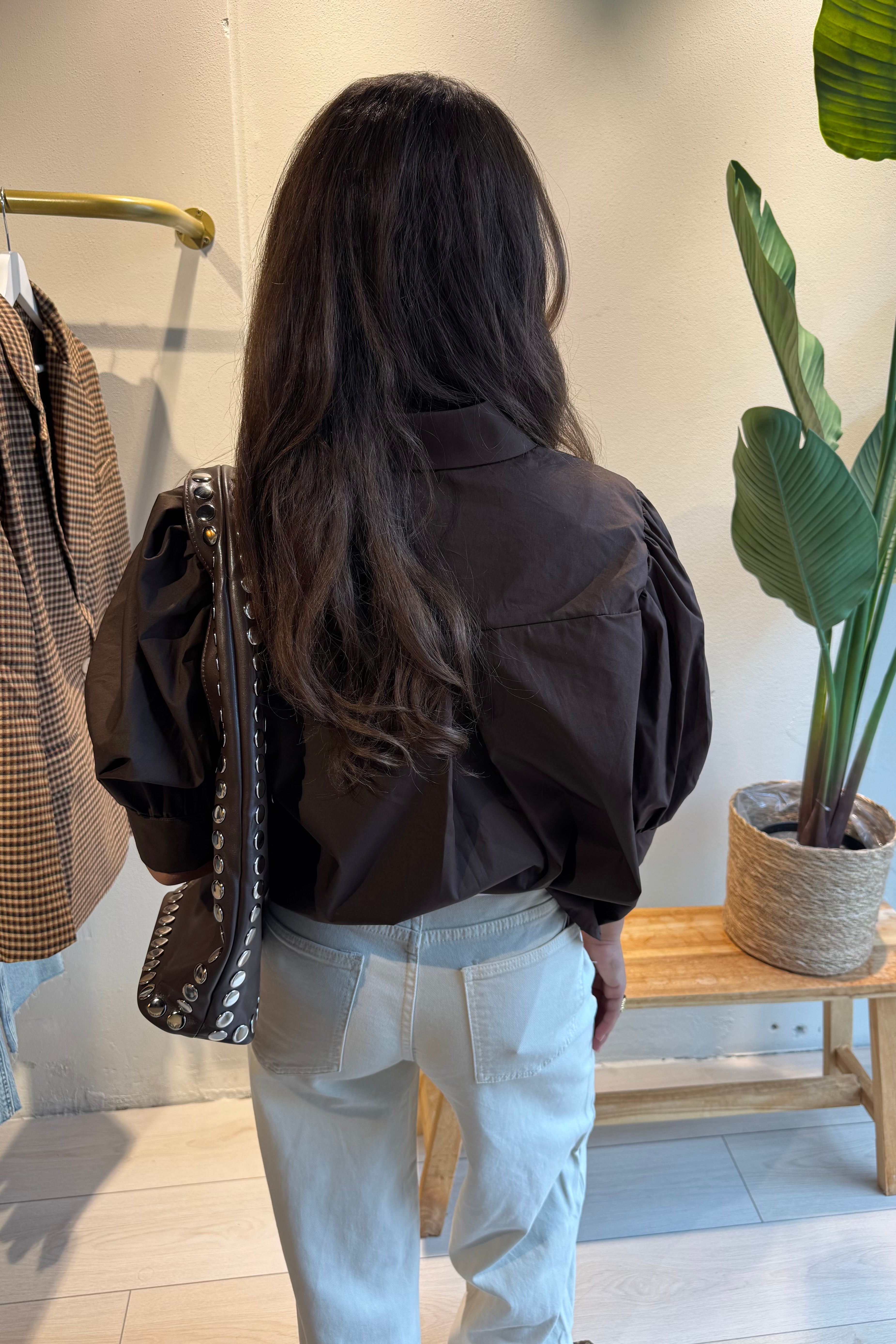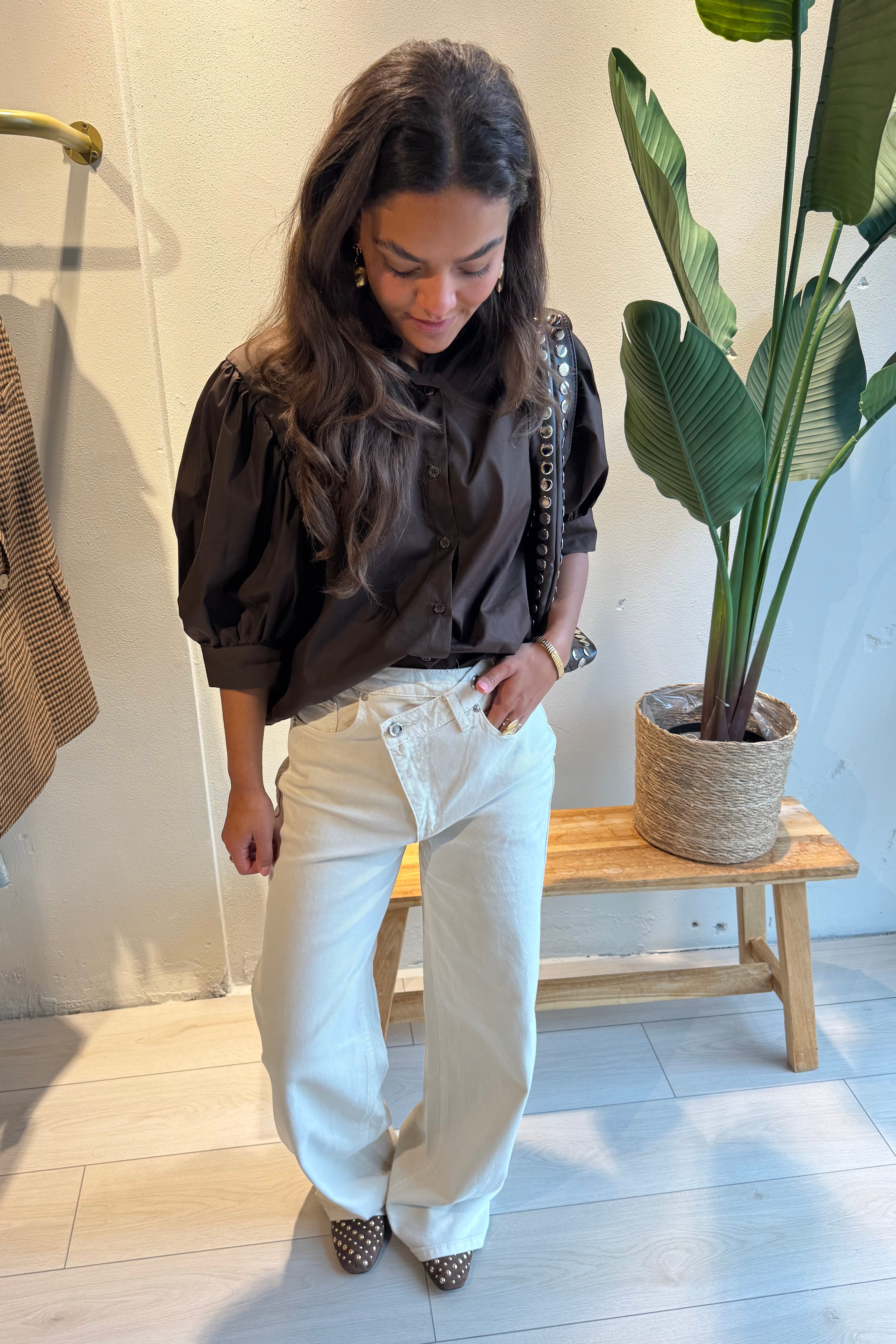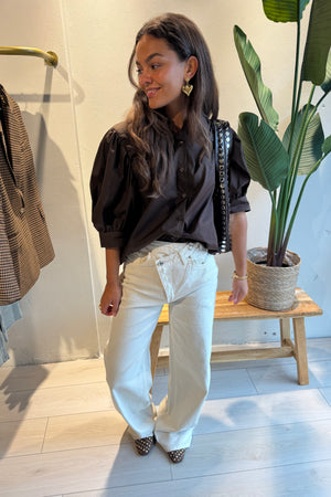Deze keer in een mooie bruine kleur – perfect voor het najaar of als neutrale basic die je eindeloos kunt combineren. De blouse heeft hetzelfde schattige kraagje en korte mouwtjes, waardoor hij lekker luchtig blijft, maar nét wat warmer oogt dan de roze versie.