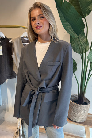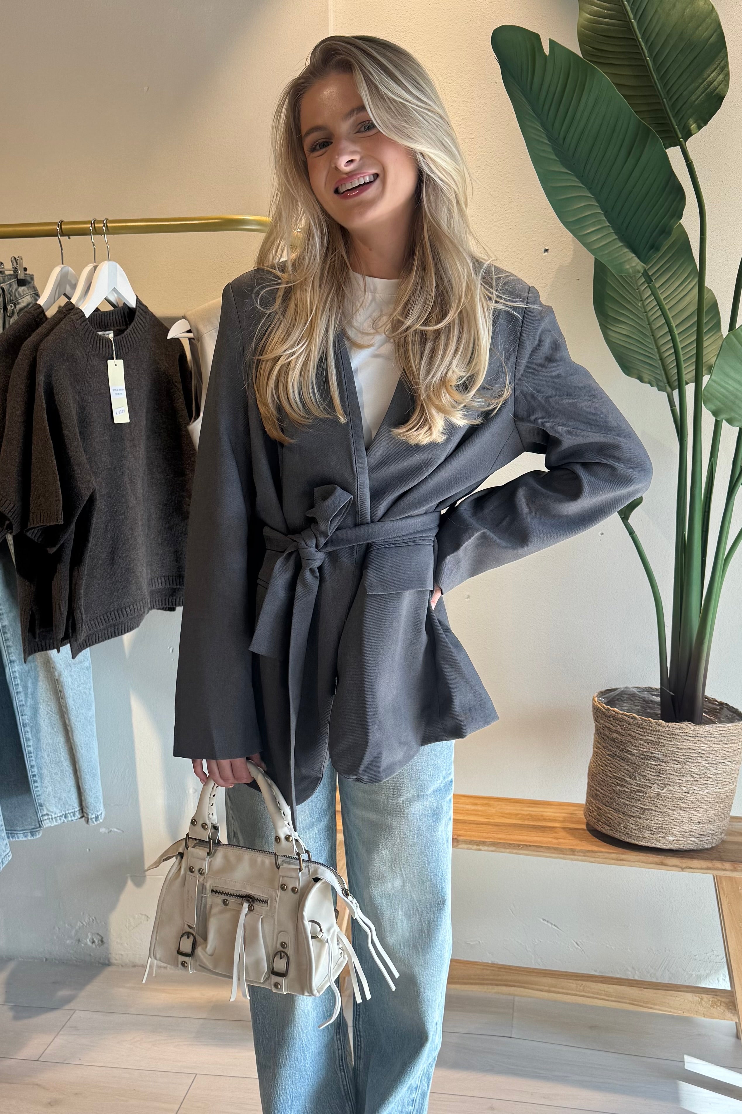 De Sascha Blazer is een donkergrijze must-have met een moderne twist. Het jasje krijgt extra flair dankzij de stoffen riem in dezelfde kleur, die je als een strik kunt dragen voor een getailleerde look. Comfortabel, stijlvol en perfect om je outfit zowel chique als casual af te maken. Het model is 167cm en draagt maat S.