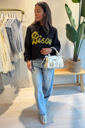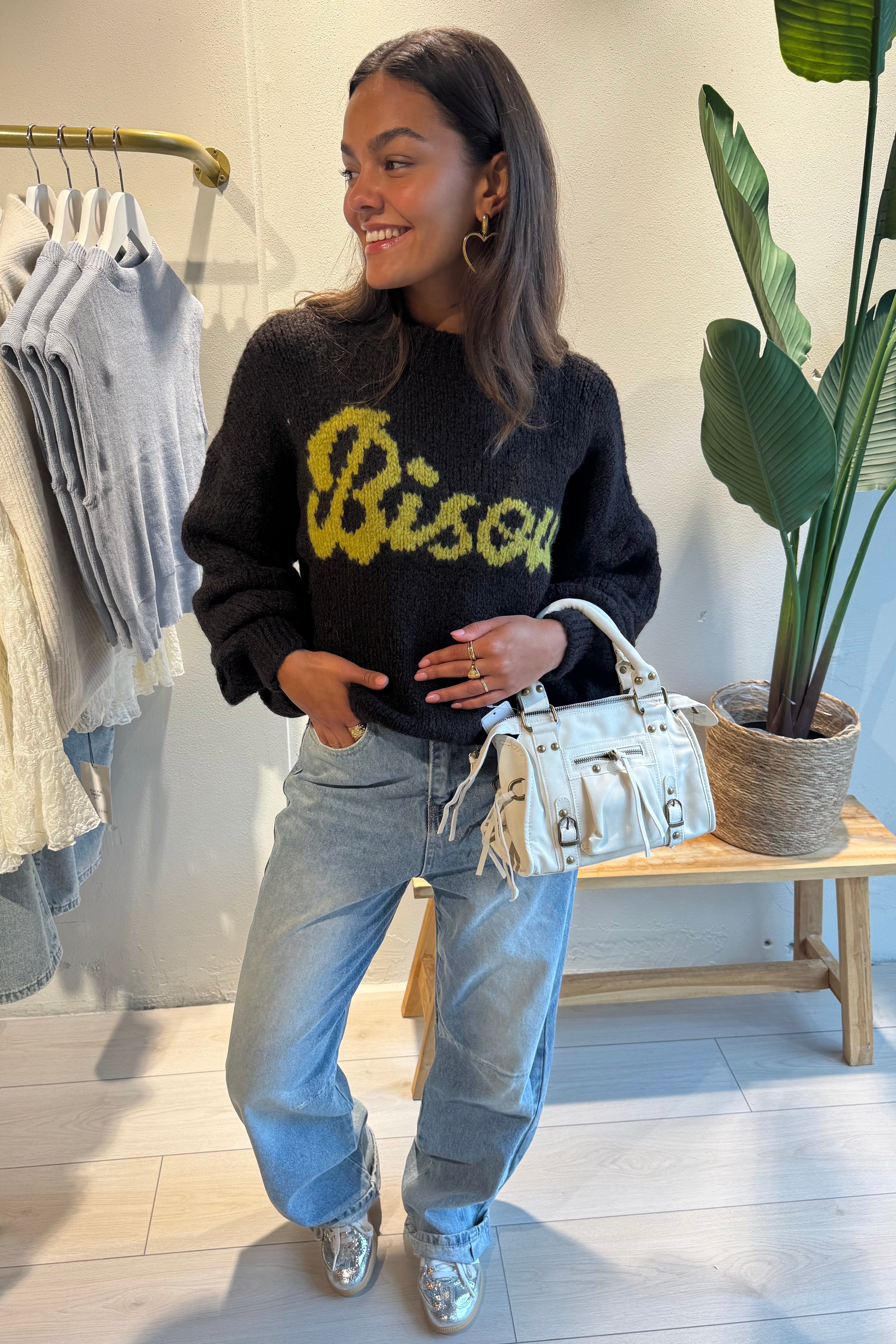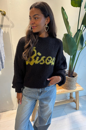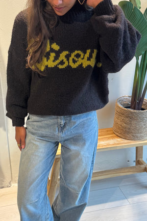 De Sena Trui is een warme, comfortabele trui met een stoere twist. De donkerbruine kleur wordt speels doorbroken met opvallende gele letters, wat zorgt voor een unieke en trendy look. Dankzij de zachte materiaalblend en de one size pasvorm zit deze trui heerlijk los en cozy – perfect voor frisse dagen.
