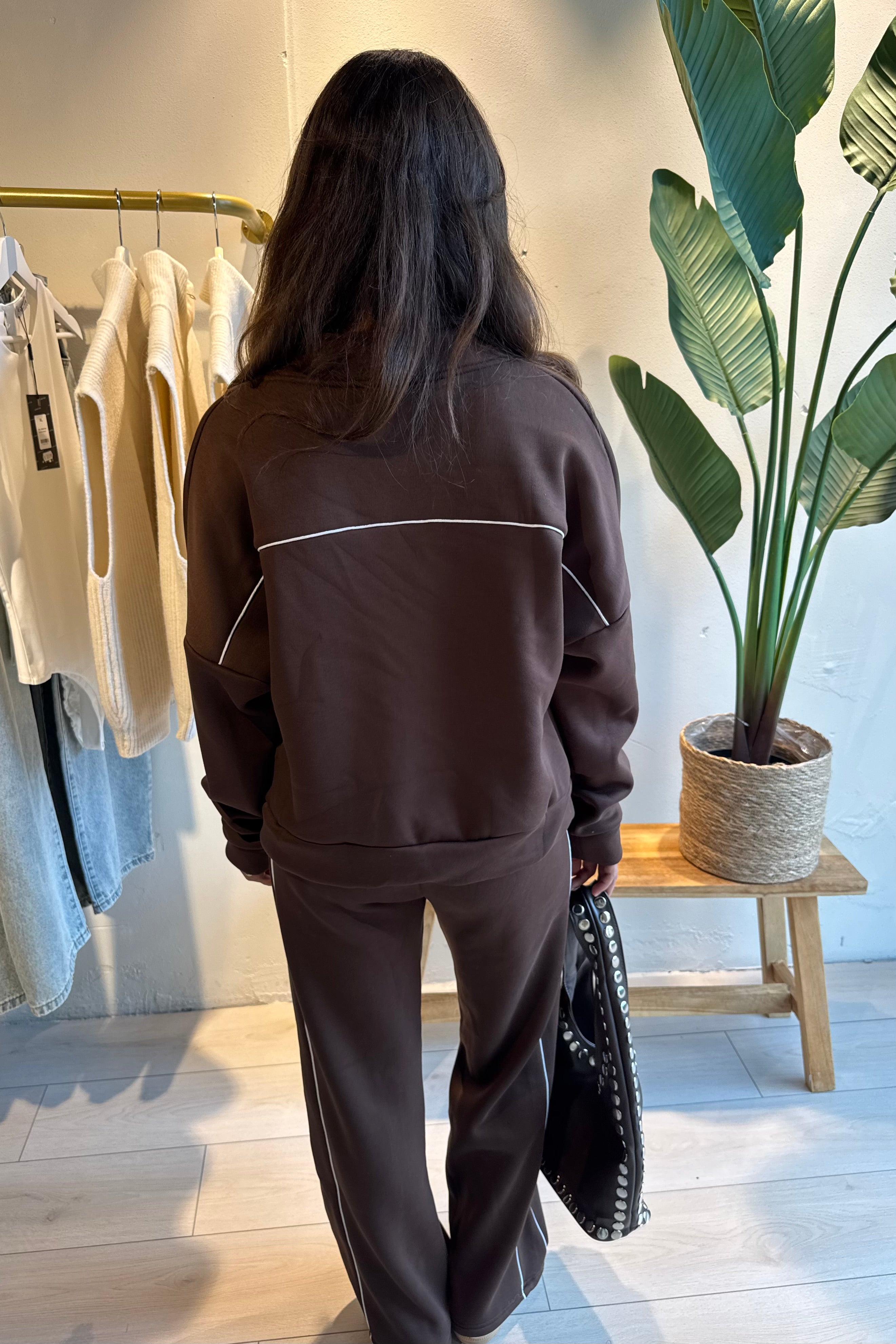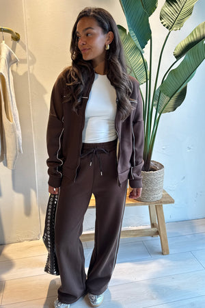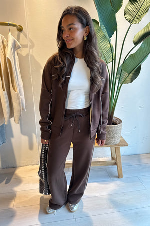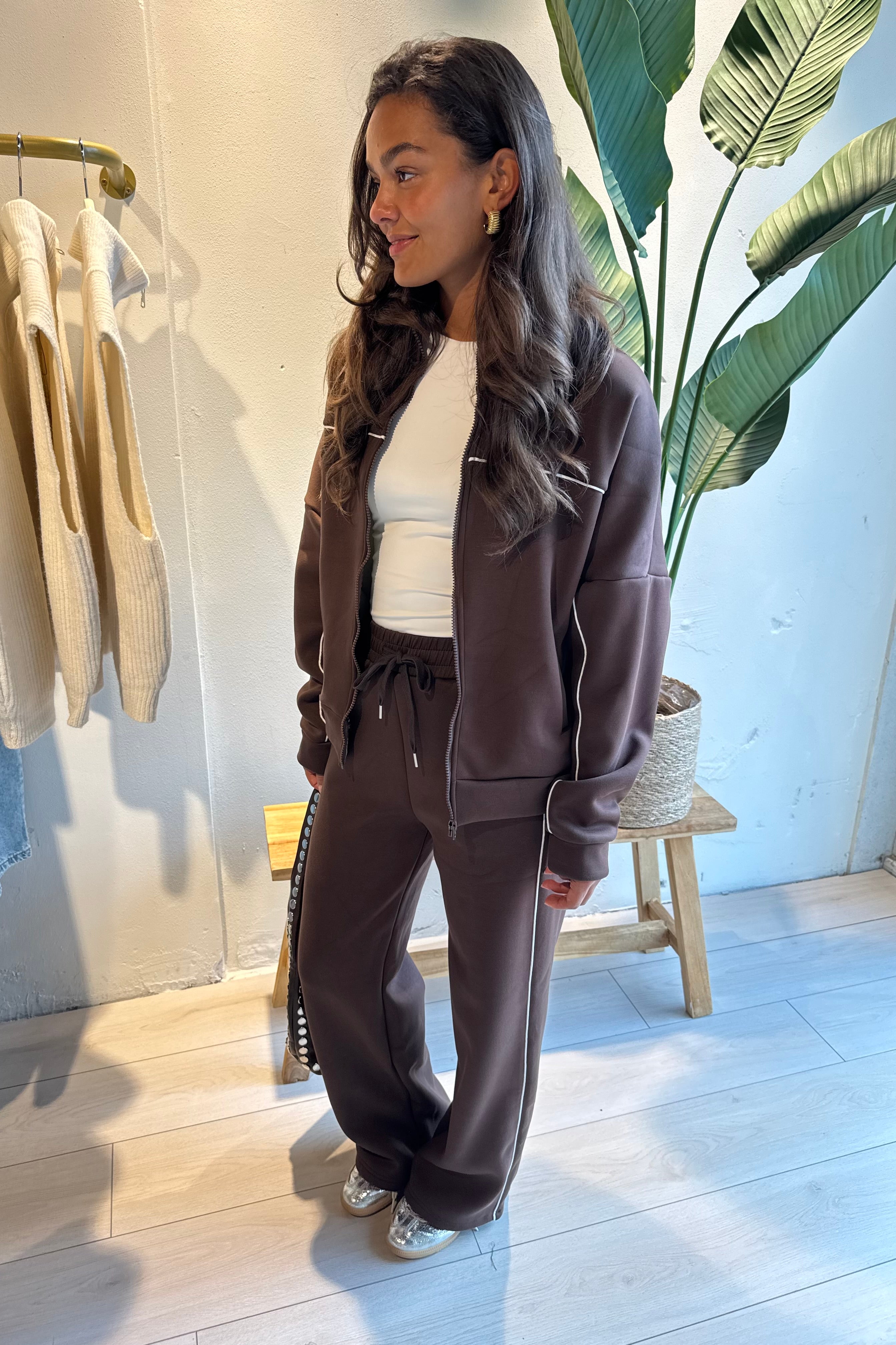 Blijf comfy én stijlvol met de Tess joggerset. Deze set bestaat uit een vestje en een bijpassende broek, beide met twee witte strepen aan de zijkant voor een sportieve en trendy touch. Van binnen is de set super zacht en heerlijk warm, dus perfect om te loungen, maar ook stijlvol genoeg om buiten te dragen. Gemaakt van een comfortabele mix van polyamide, rayon en een beetje elasthaan voor de perfecte pasvorm.