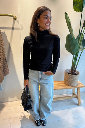 De Turtle Neck is zo’n basic die altijd goed is. Dit zwarte truitje heeft een aansluitende pasvorm met een hoge col en lange mouwen – perfect om los te dragen of als laagje onder een blazer, vest of jasje. De stof voelt zacht, stretchy en glad aan, waardoor hij supercomfortabel zit én mooi valt.