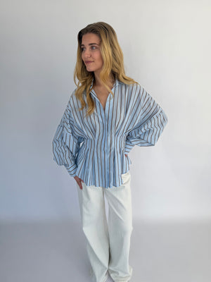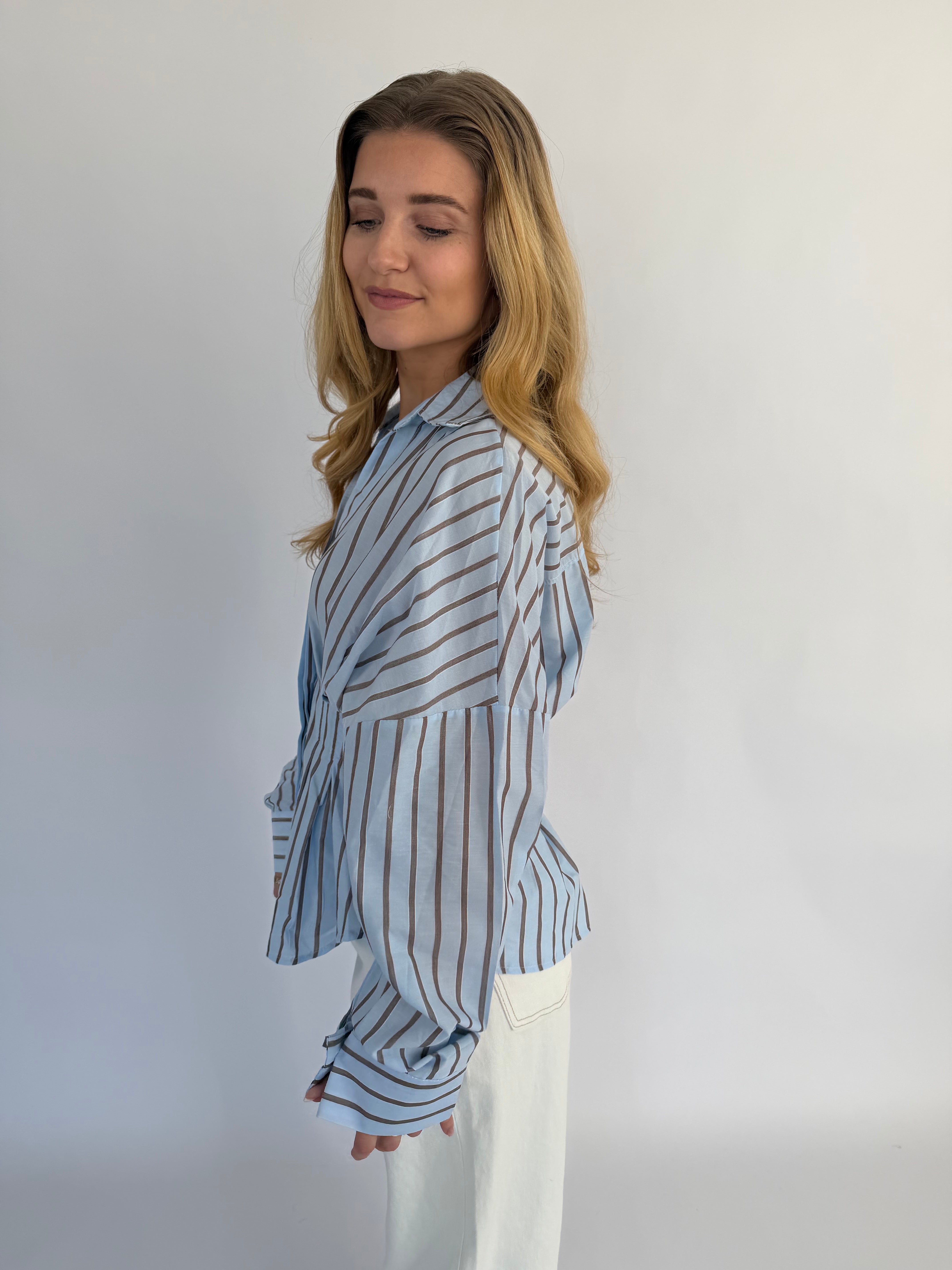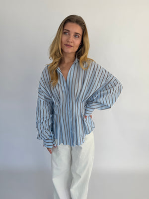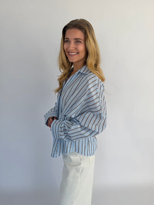 Vionne Blouse in lichtblauw met bruine strepen