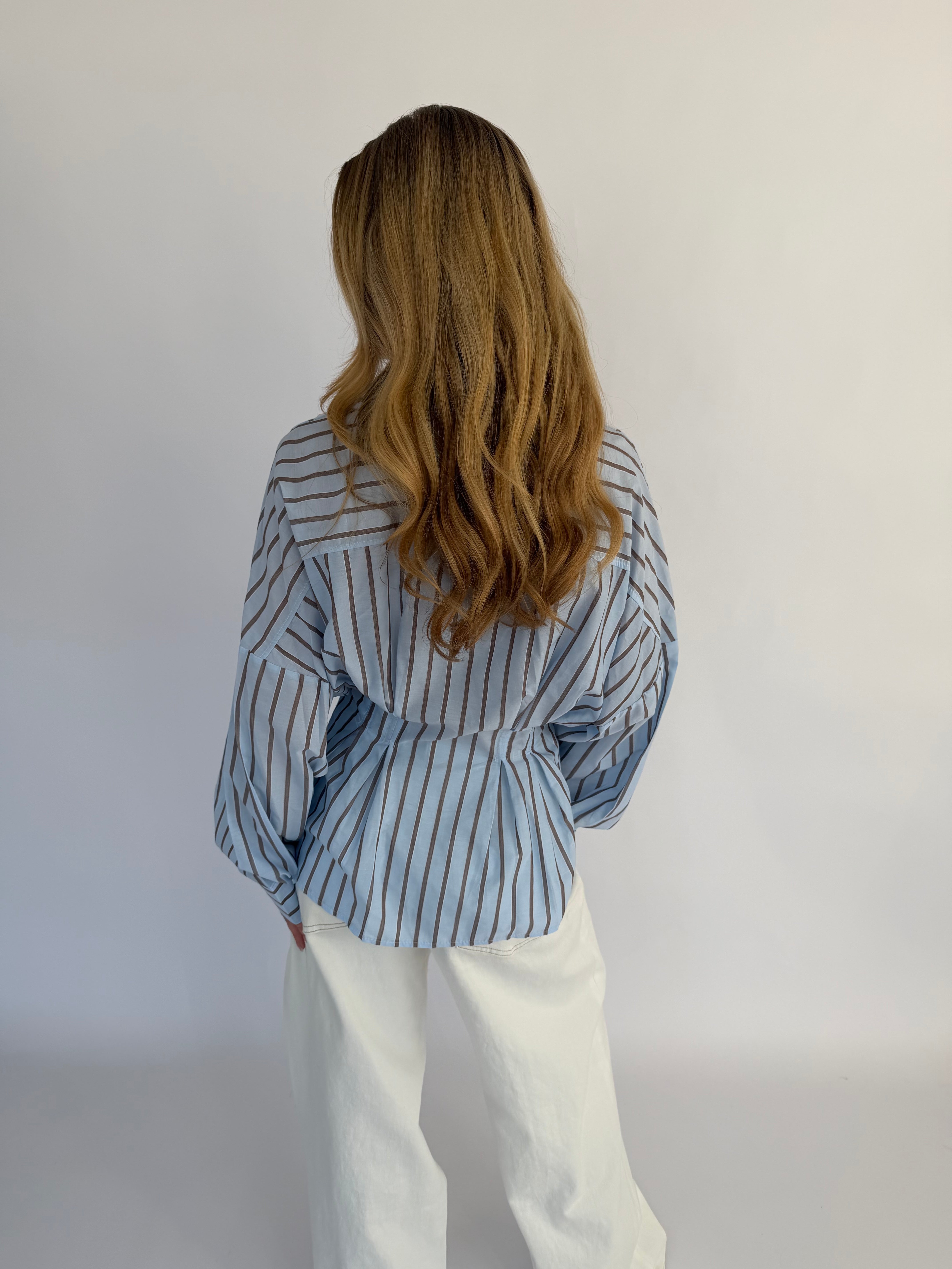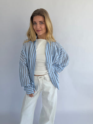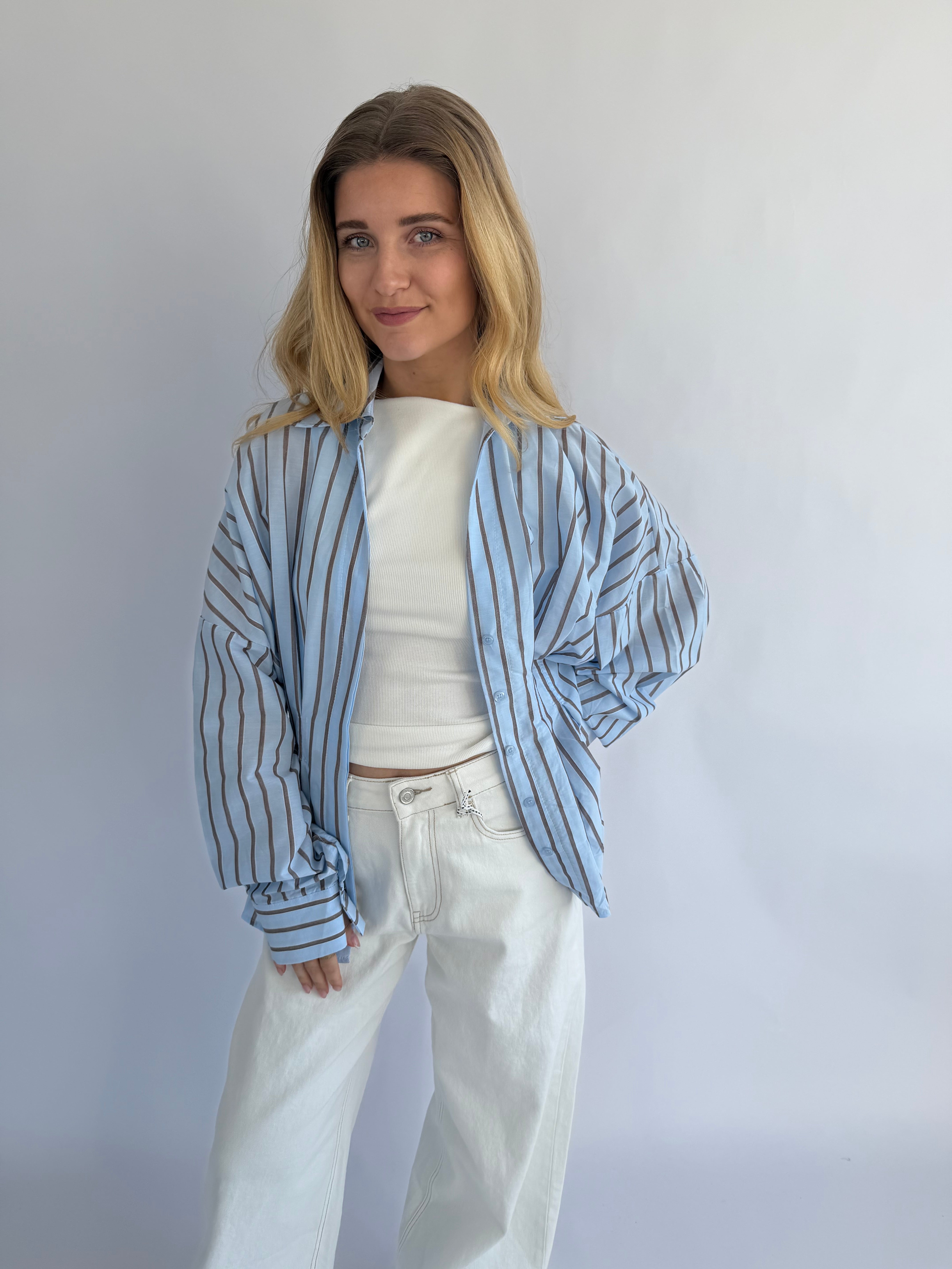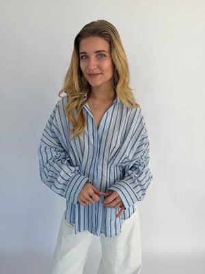 Vionne Blouse, een luchtige en stijlvolle blouse in een zachte lichtblauwe kleur met subtiele bruine strepen. Het tijdloze design geeft een verfijnde, maar toch speelse uitstraling, ideaal om elke outfit een frisse touch te geven.