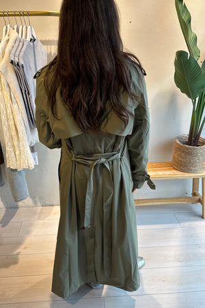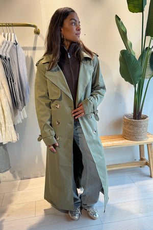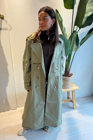 De Liora trench is een stijlvolle en vrouwelijke lange jas die elke outfit compleet maakt. Met de knoopsluiting en bijpassende ceintuur accentueer je moeiteloos je taille. De elegante groene kleur en het tijdloze model maken deze jas een echte musthave voor het tussenseizoen.