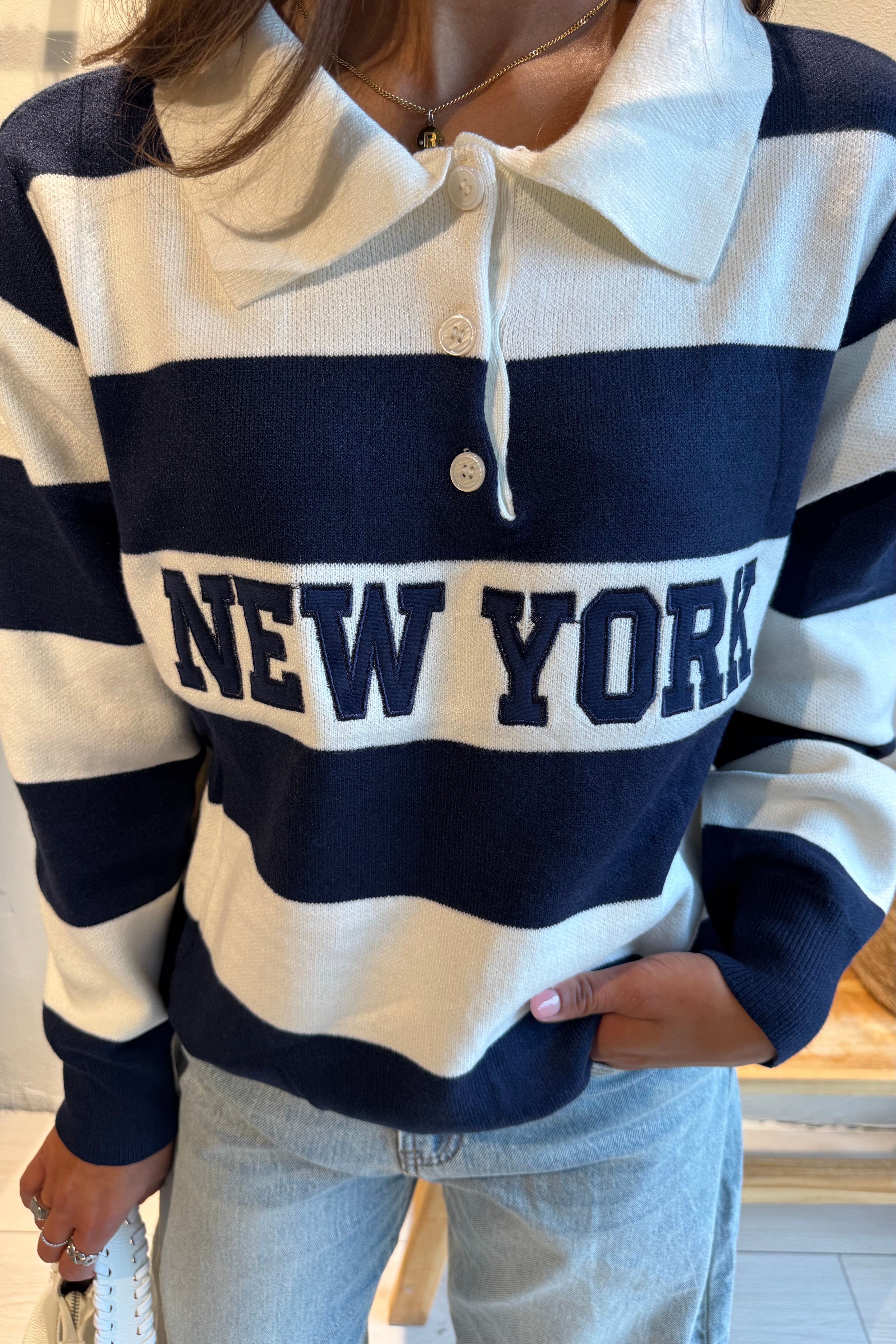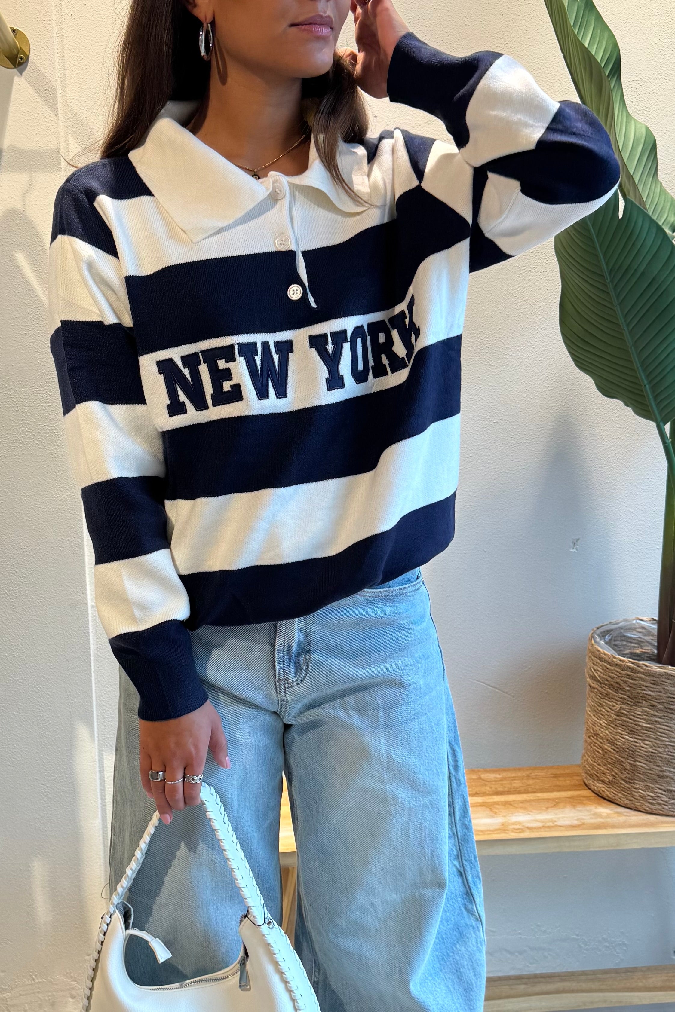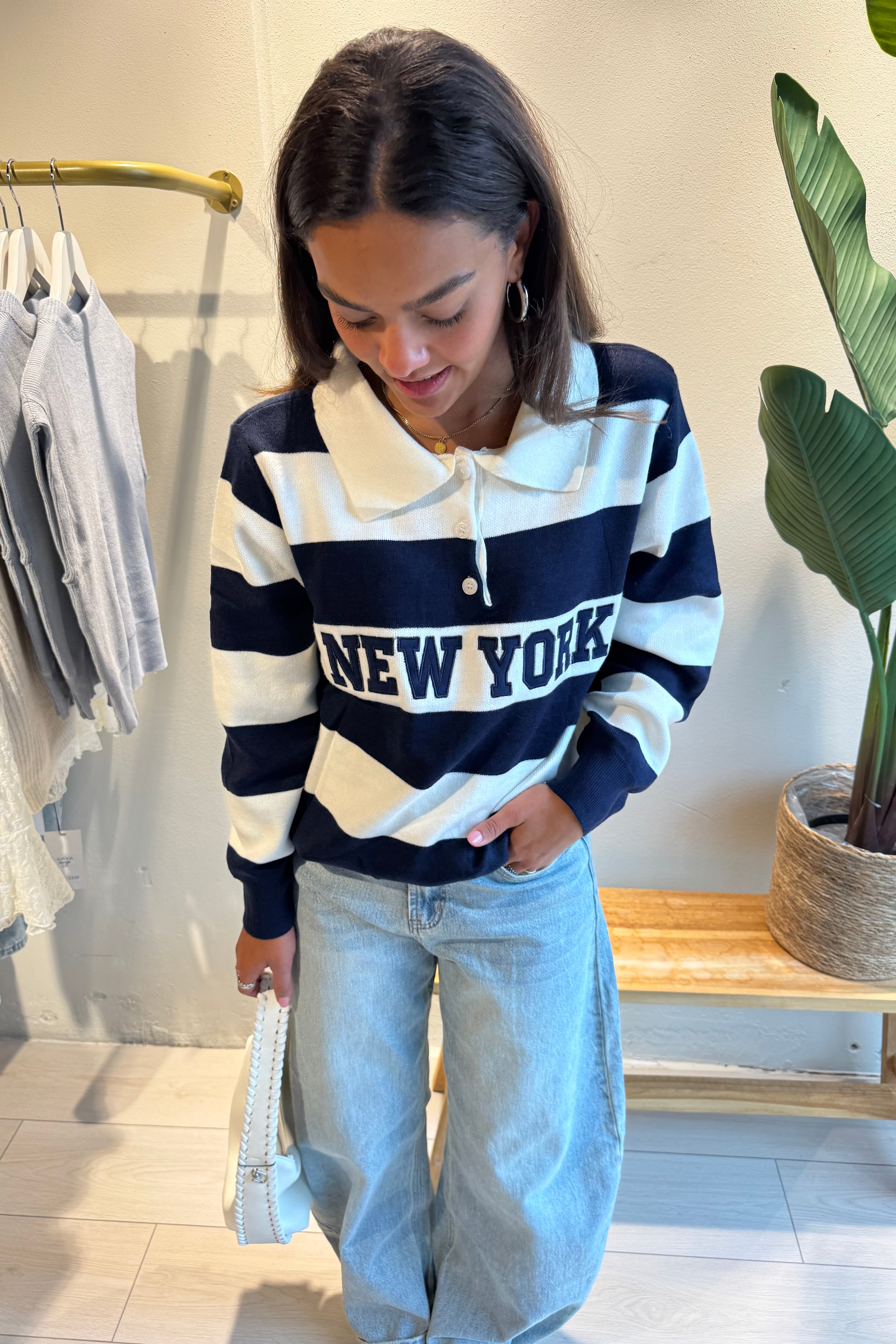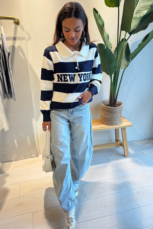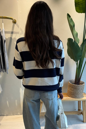 De Yune Trui is een sportieve en stijlvolle polo trui met een vrouwelijke touch. Hij is donkerblauw met witte strepen en afgewerkt met een kraagje en twee knoopjes – een subtiel detail dat de trui nét wat extra’s geeft. De zachte en rekbare stof zorgt voor ultiem draagcomfort, en dankzij de one size pasvorm is hij geschikt voor veel lichaamsvormen.
